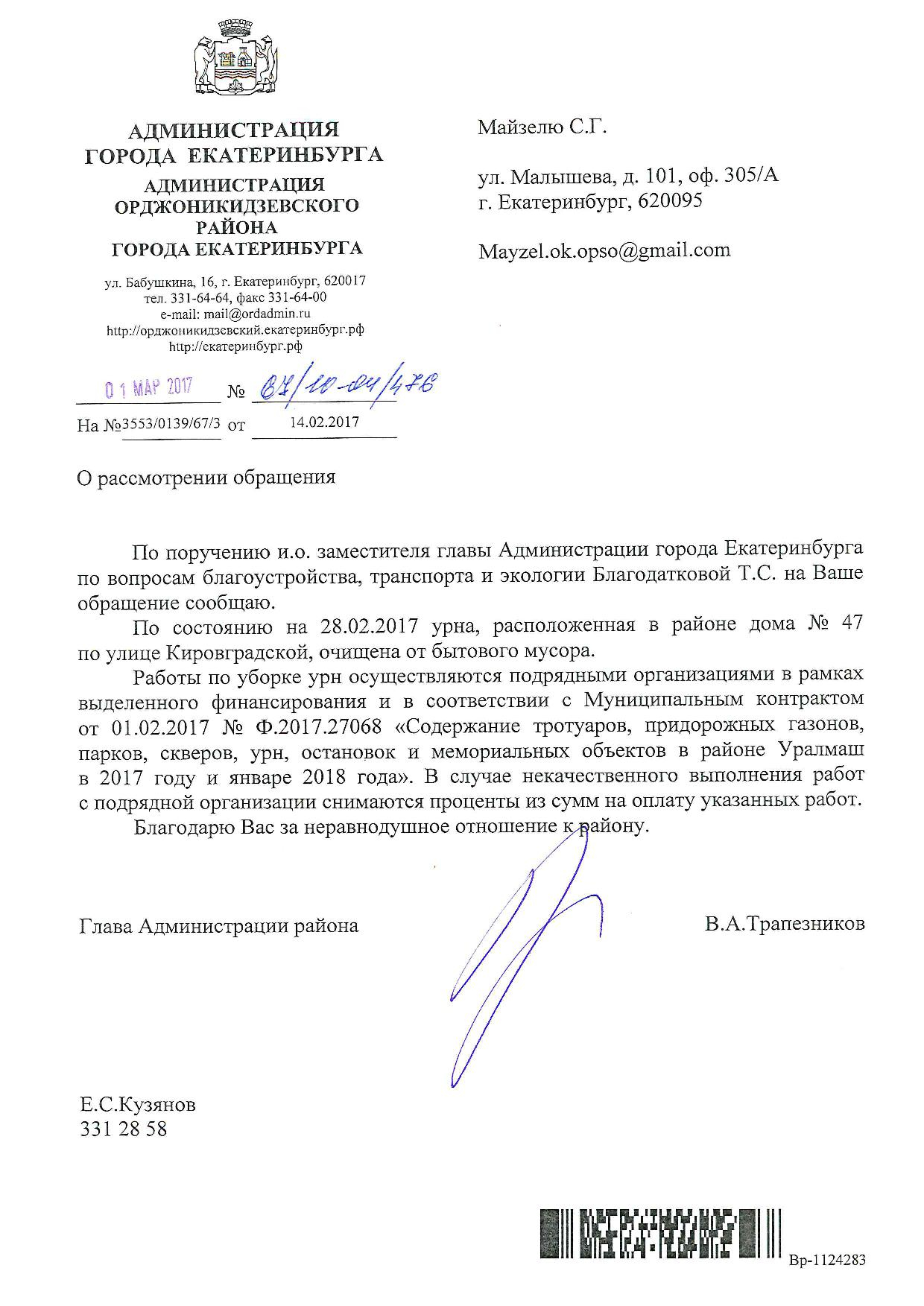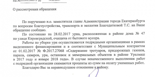 Номер жалобы:14380 Тип жалобы:Ненадлежащее содержание малых архитектурных форм Название объекта:Администрация Екатеринбурга Регион:Свердловская область Город:Екатеринбург Адрес:Кировградская ул., 47 Описание жалобы:Отсутствует уборка урны на нечётной стороне Кировградской у дома 47. Статус: