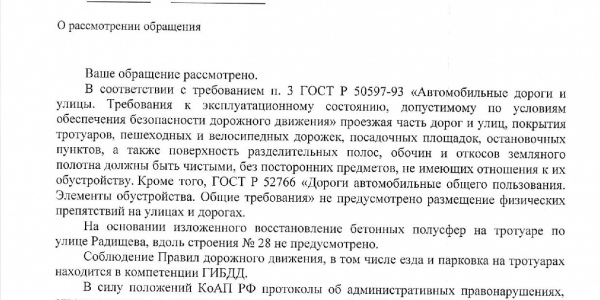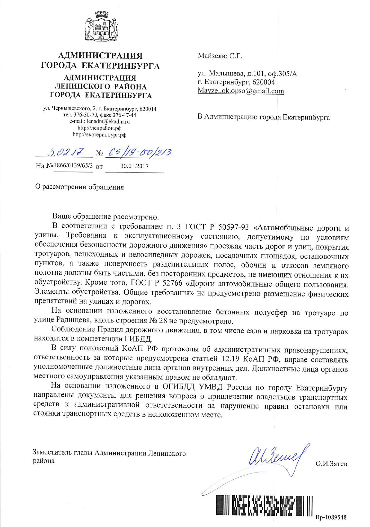 Номер жалобы:13837 Тип жалобы:Ненадлежащее содержание малых архитектурных форм Название объекта:Администрация Екатеринбурга Регион:Свердловская область Город:Екатеринбург Адрес:ул. Радищева, 28 Описание жалобы:Ненадлежащее содержание парковочных полусфер: необходимо произвести восстановление нескольких демонтированных полусфер. Статус: