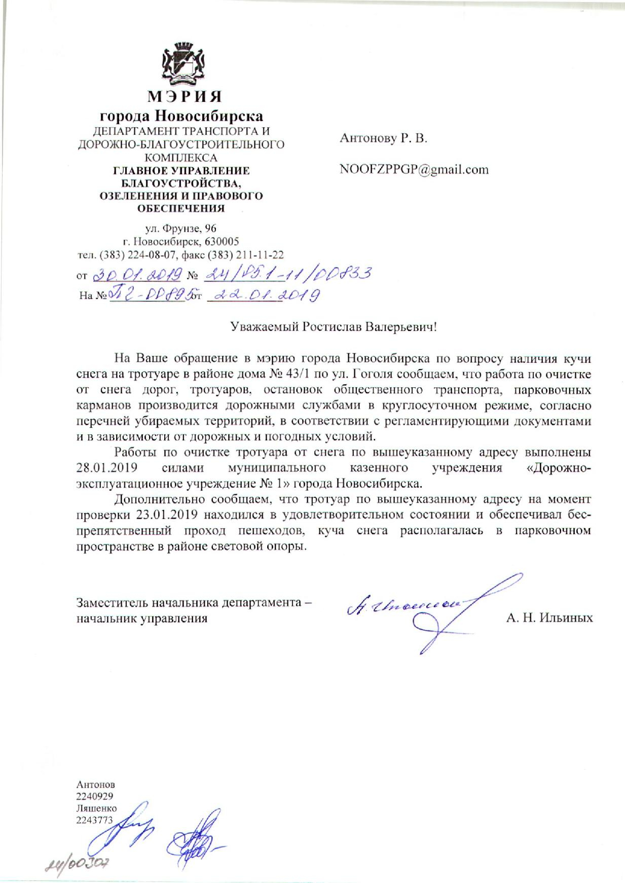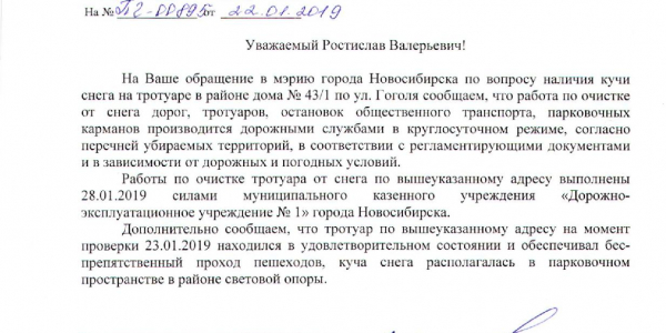 Номер жалобы:48529 Тип жалобы:Иные проблемы ЖКХ Название объекта: Регион:Новосибирская область Город:Новосибирск Адрес:Новосибирск, улица Гоголя, 43/1 Описание жалобы:Куча снега на тротуаре не убрана Статус: