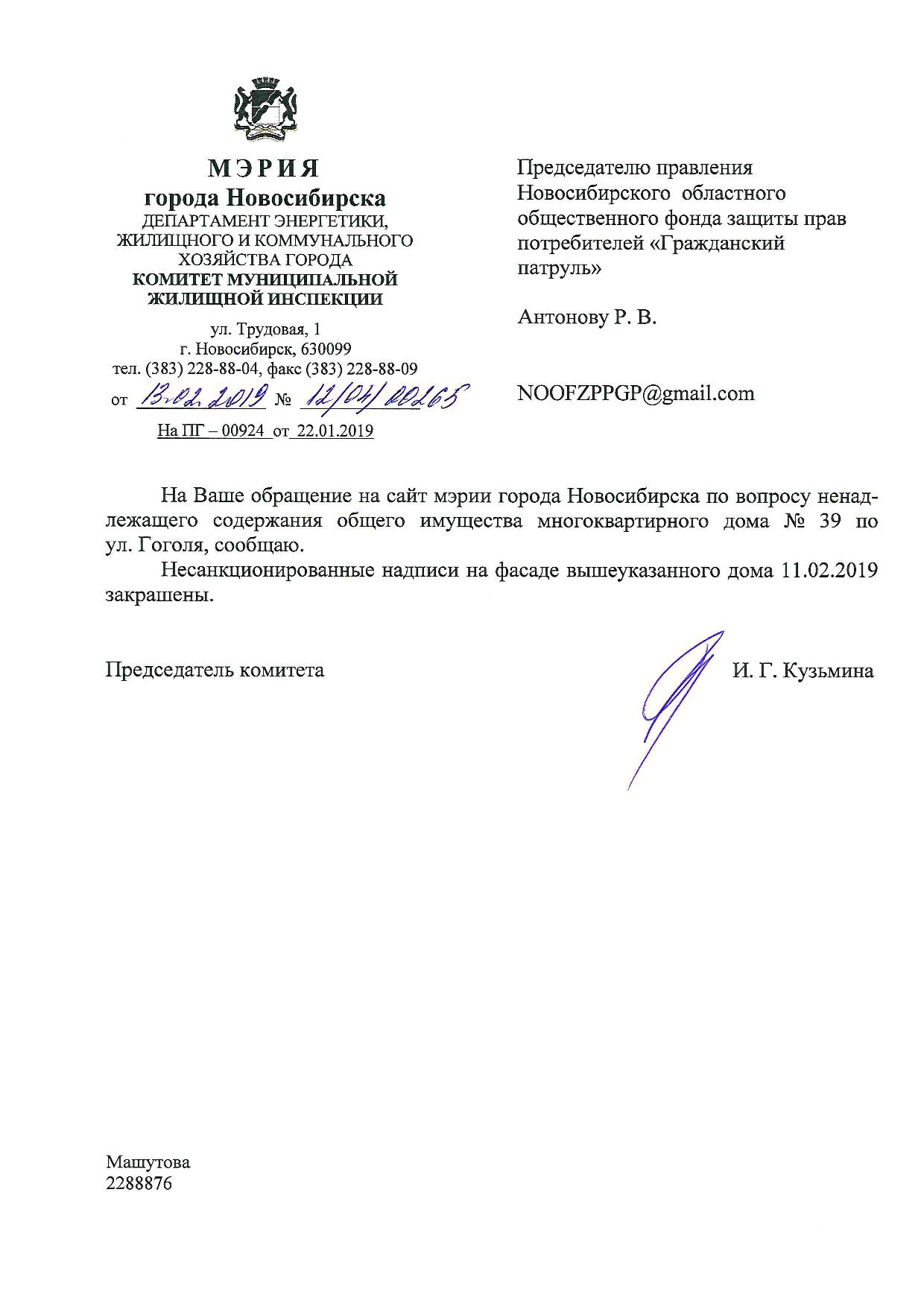 Номер жалобы:48530 Тип жалобы:Иные проблемы ЖКХ Название объекта: Регион:Новосибирская область Город:Новосибирск Адрес:улица Гоголя, 39 Описание жалобы:Надписи на фасаде дома Статус: