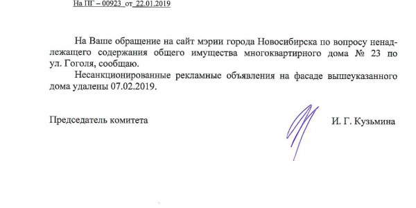 Номер жалобы:48528 Тип жалобы:Иные проблемы ЖКХ Название объекта: Регион:Новосибирская область Город:Новосибирск Адрес:улица Гоголя, 27 Описание жалобы:Объявления в неположенном месте Статус: