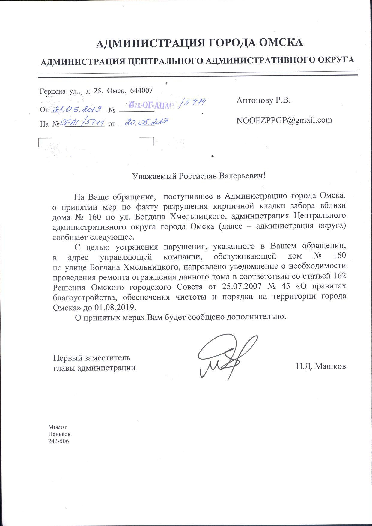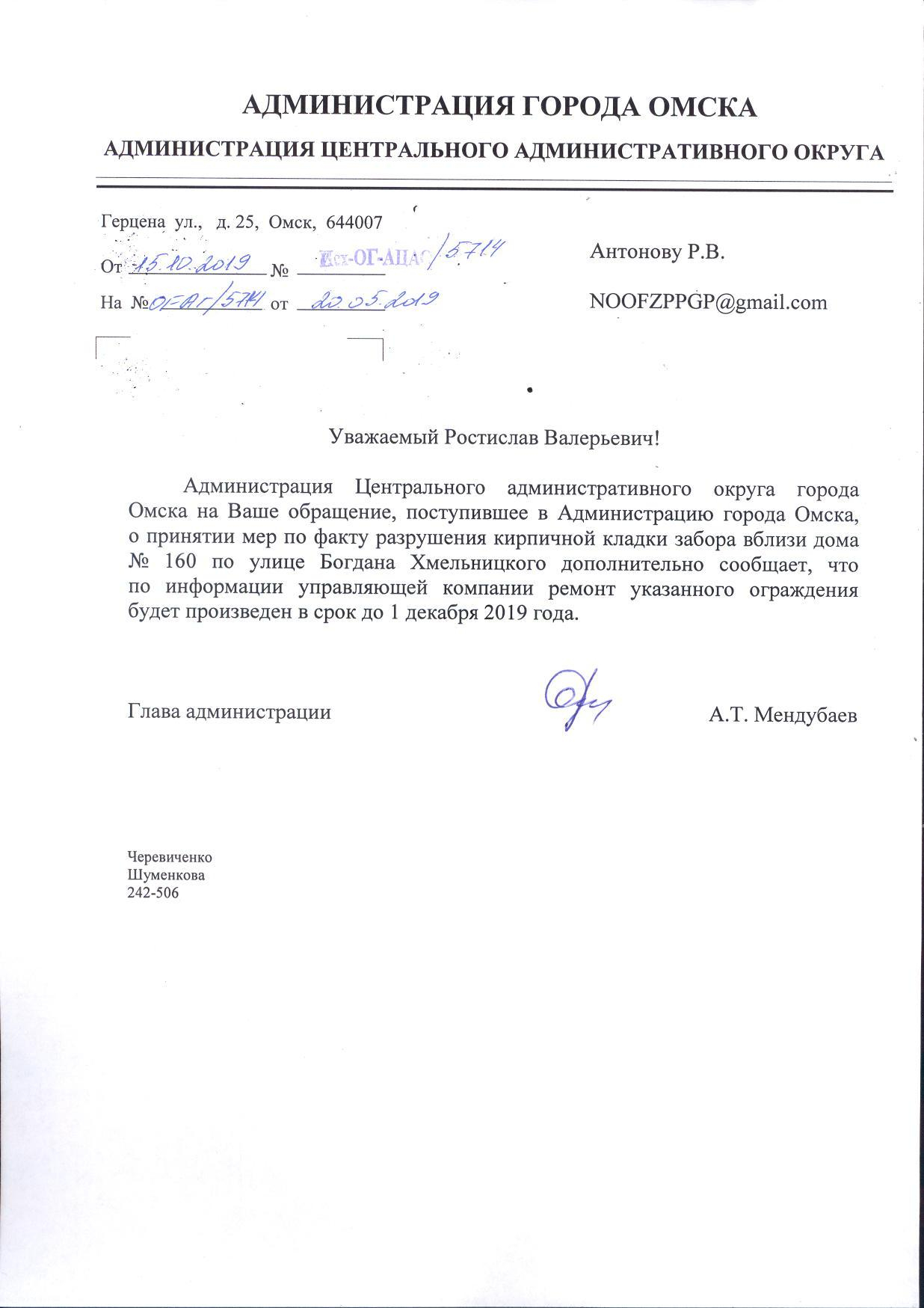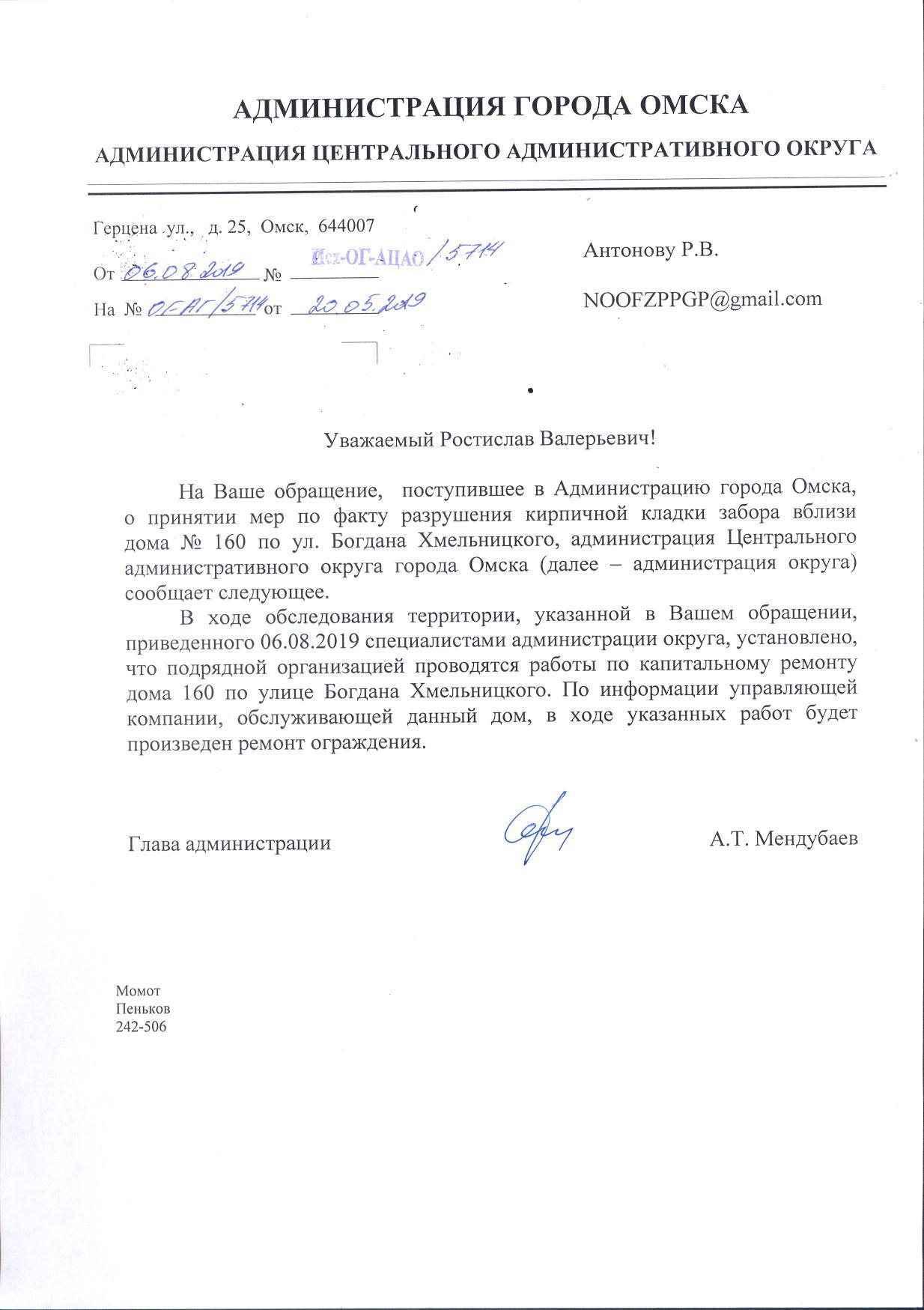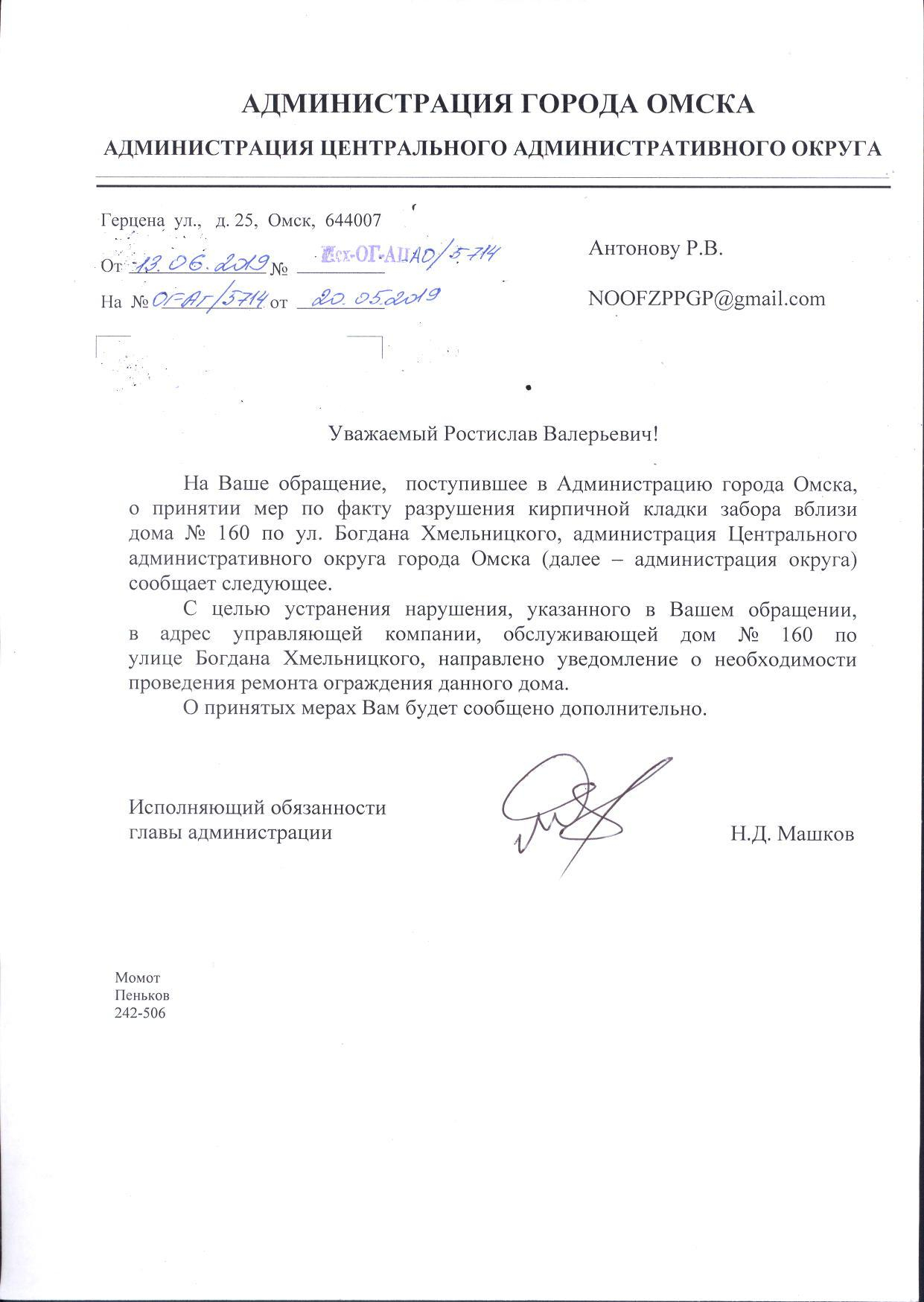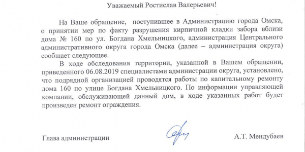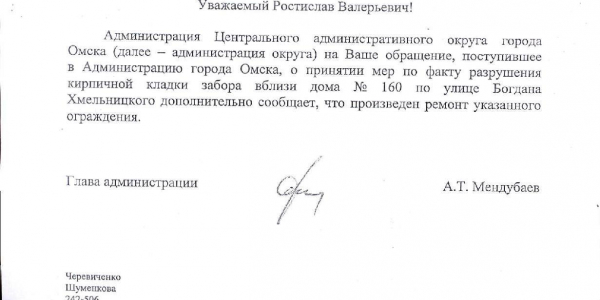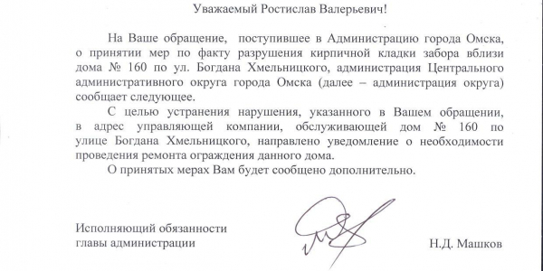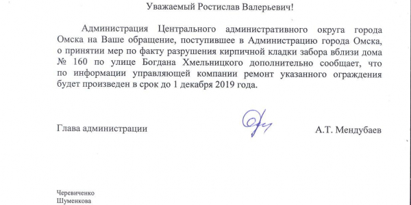 Номер жалобы:48384 Тип жалобы:Городская среда Название объекта: Регион:Омская область Город:Омск Адрес:ул. Богдана Хмельницкого, 160 Описание жалобы:разрушение кирпичной кладки забора Статус: