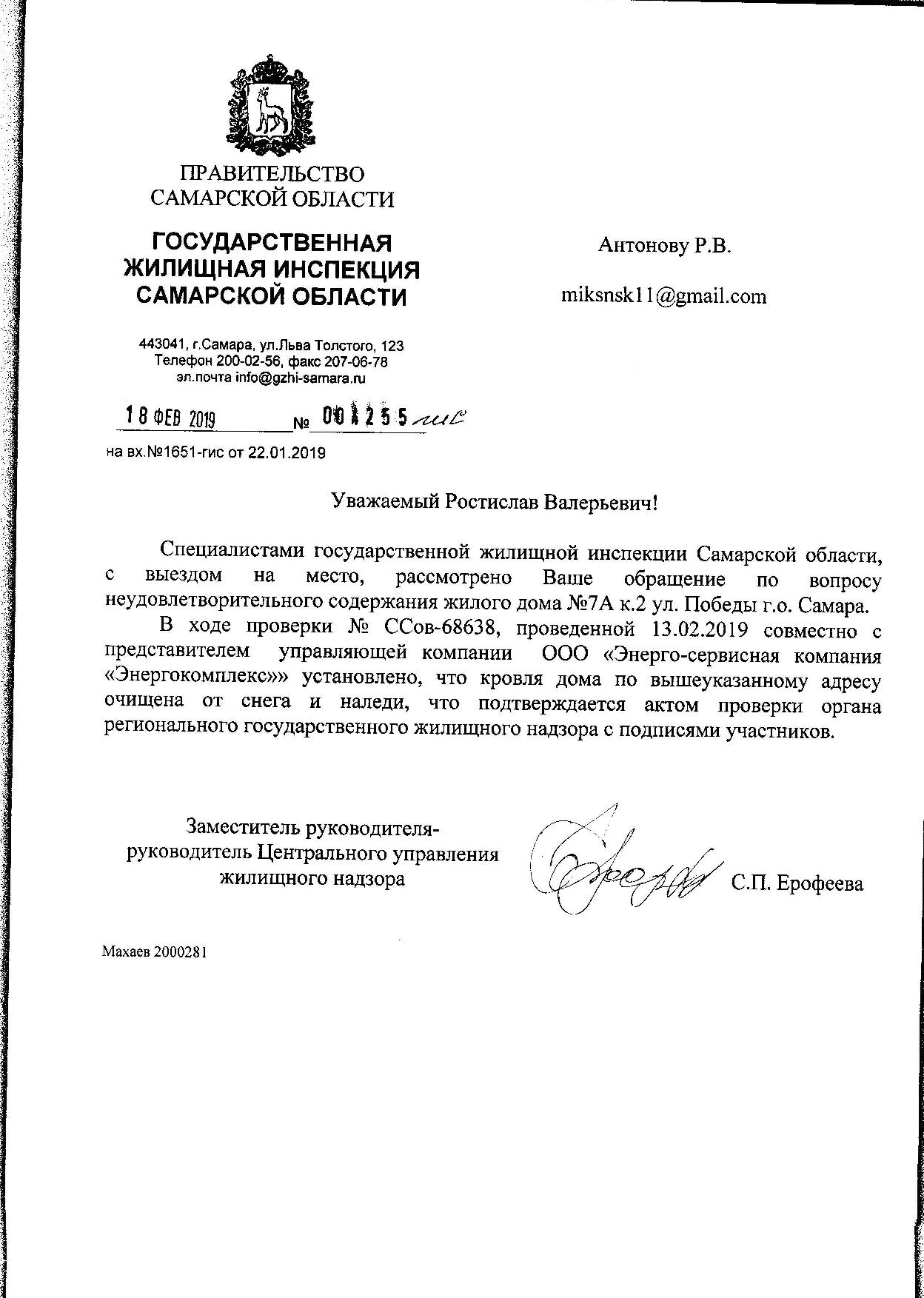 Номер жалобы:48397 Тип жалобы:Городская среда Название объекта: Регион:Самарская область Город:Самара Адрес:ул. Победы, 7а к2 Описание жалобы:Ул. Победы 7а корпус 2 - висят глыбы льда,вода сочится по перекрытиям на чердак и затапливает квартиры на 5- м этаже. Ук ООО ЭСКО Энергокомплекс на просьбы очистить крышу от снега и наледи не реагирует. Статус: