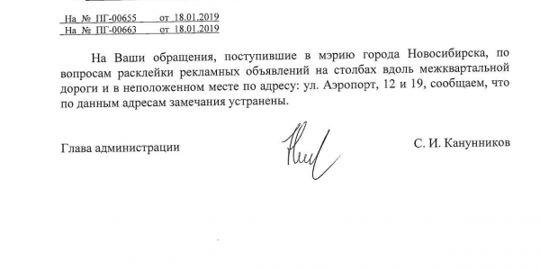 Номер жалобы:48360 Тип жалобы:Иные проблемы ЖКХ Название объекта: Регион:Новосибирская область Город:Новосибирск Адрес:Новосибирск, улица Аэропорт, 12 Описание жалобы:Объявления в неположенном месте Статус: