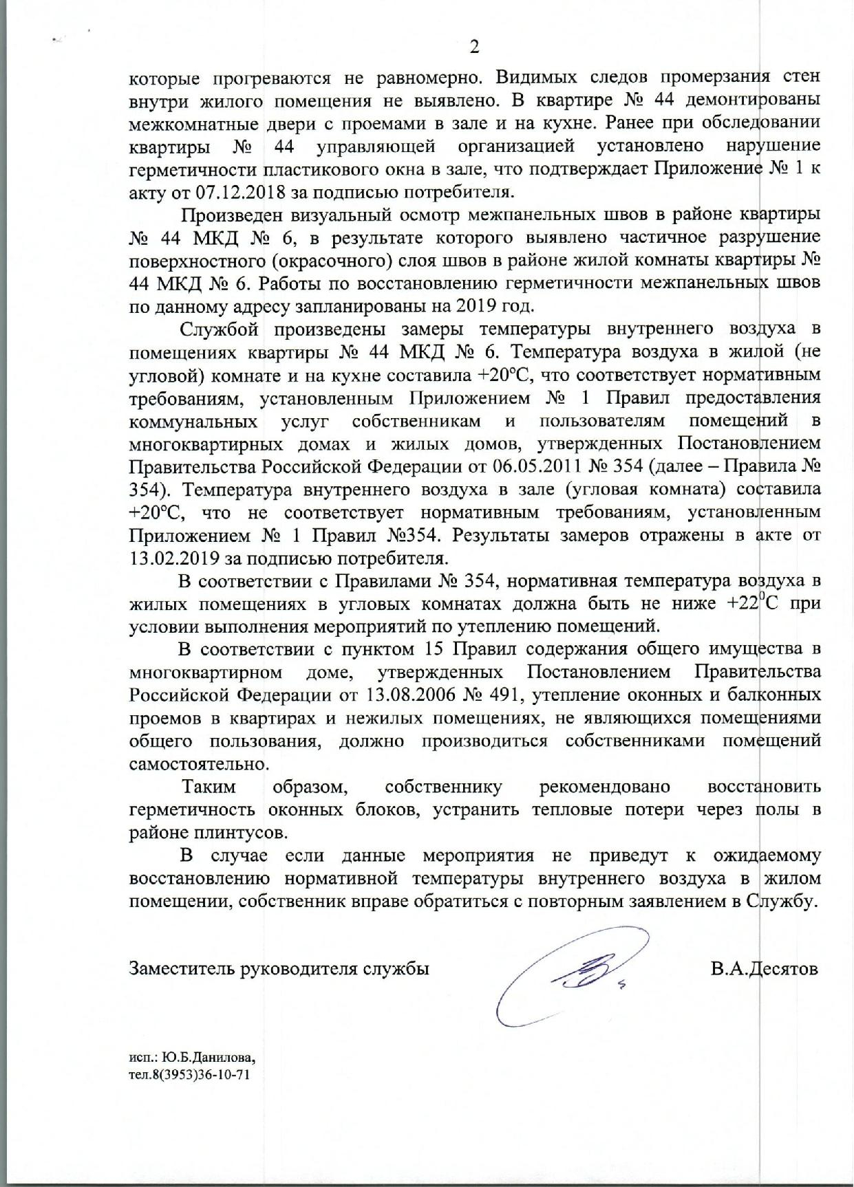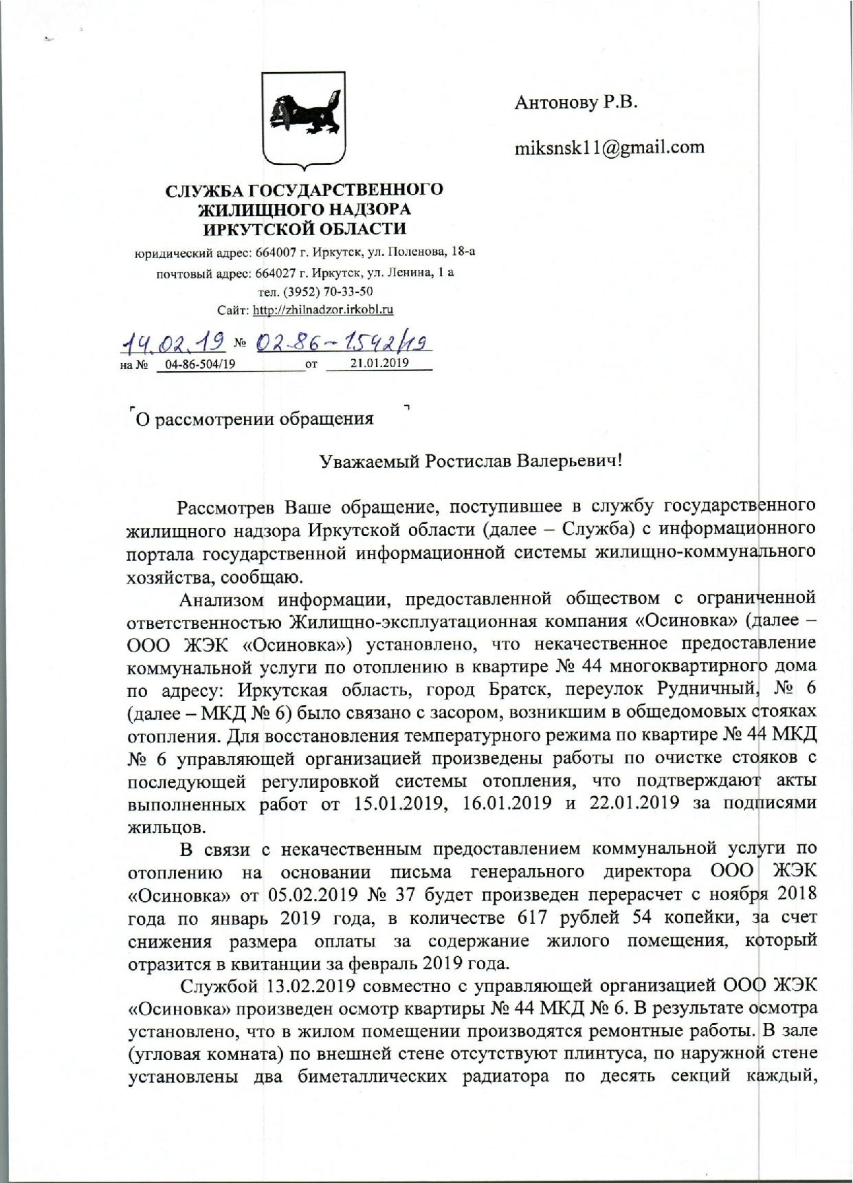 Номер жалобы:47968 Тип жалобы:Иные проблемы ЖКХ Название объекта:ЖЭК Осиновка Регион:Иркутская область Город:Братск Адрес:пер. Рудничный 6 Описание жалобы:В квартирах холодина. Батареи холодные. Акт замеров температуры сделан. Куча обещаний от руководителей ЖЭК разного уровня. Полтора месяца никаких движений.