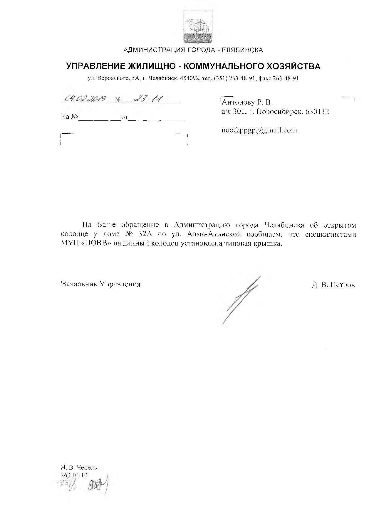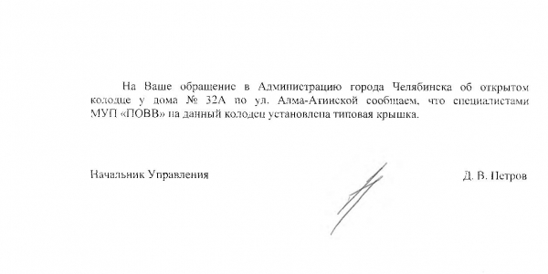 Номер жалобы:47991 Тип жалобы:Иные проблемы ЖКХ Название объекта: Регион:Челябинская область Город:Челябинск Адрес:ул Алма-Атинская, 32а Описание жалобы:открытый люк Статус: