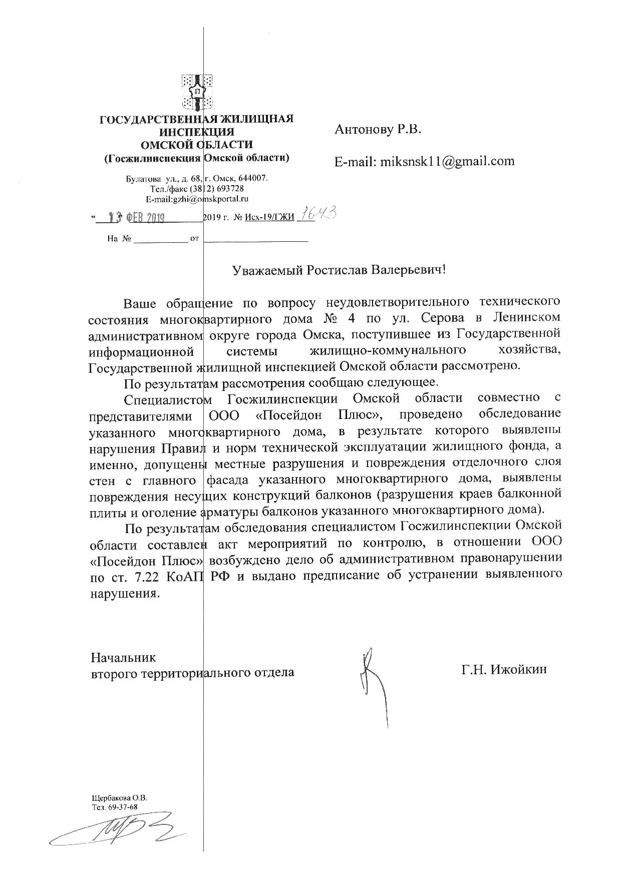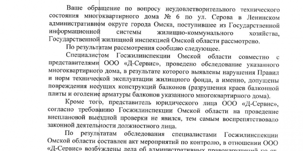 Номер жалобы:48181 Тип жалобы:Здания / строительство (здание не приспособлено для инвалидов, нет ограждения при строительстве и т.д.) Название объекта: Регион:Омская область Город:Омск Адрес:ул. Серова, 4 Описание жалобы:Разрушение фундамента жилого дома, балкона и других элементов фасада Статус: