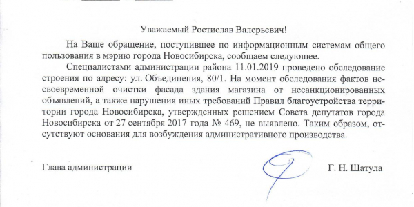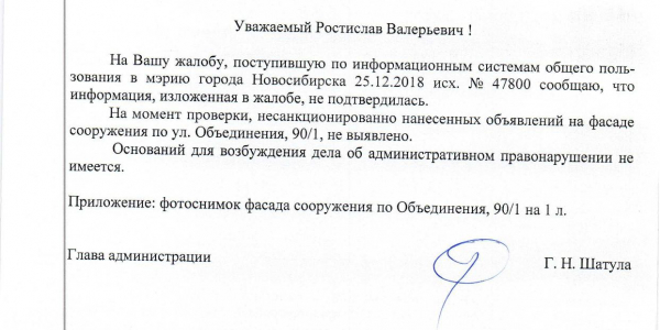 Номер жалобы:47788 Тип жалобы:Иные проблемы ЖКХ Название объекта: Регион:Новосибирская область Город:Новосибирск Адрес:ул Объединения, 80/1 Описание жалобы:Объявления на фасаде дома Статус: