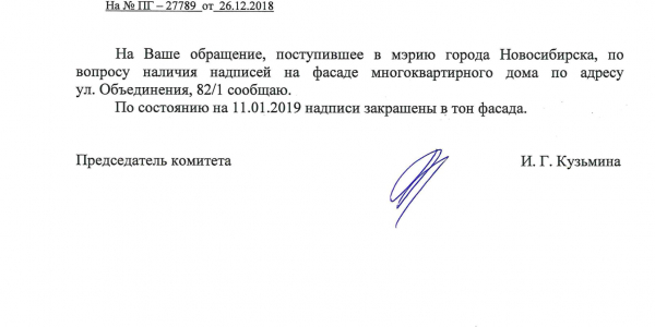 Номер жалобы:47794 Тип жалобы:Иные проблемы ЖКХ Название объекта: Регион:Новосибирская область Город:Новосибирск Адрес:Новосибирск, улица Объединения, 82/1 Описание жалобы:Надписи на фасаде дома Статус: