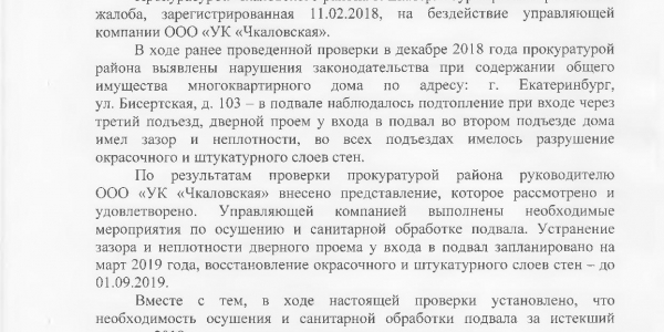Номер жалобы:47520 Тип жалобы:Иные проблемы ЖКХ Название объекта:УК Чкаловская Регион:Свердловская область Город:Екатеринбург Адрес:ул Бисертская, 103 Описание жалобы:Здравствуйте, хочу рассказать проблему нашего дома по адресу г Екатеринбург ул Бисертская 103 ужасная вонь из подвала травит весь дом , не говоря уже о комарах круглый год, кусают всех. В нашем доме много детей и стариков , ужасное состояние подъезда, электрокабеля не чем не закрыты, оголены, ремонт не делался уже давно, помогите пожалуйста разобраться. Статус: