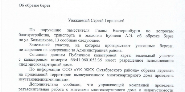 Номер жалобы:47369 Тип жалобы:Иные проблемы ЖКХ Название объекта: Регион:Свердловская область Город:Екатеринбург Адрес:ул Большакова, 13 Описание жалобы:Подрезали березы на манер тополей около детской площадки Статус: