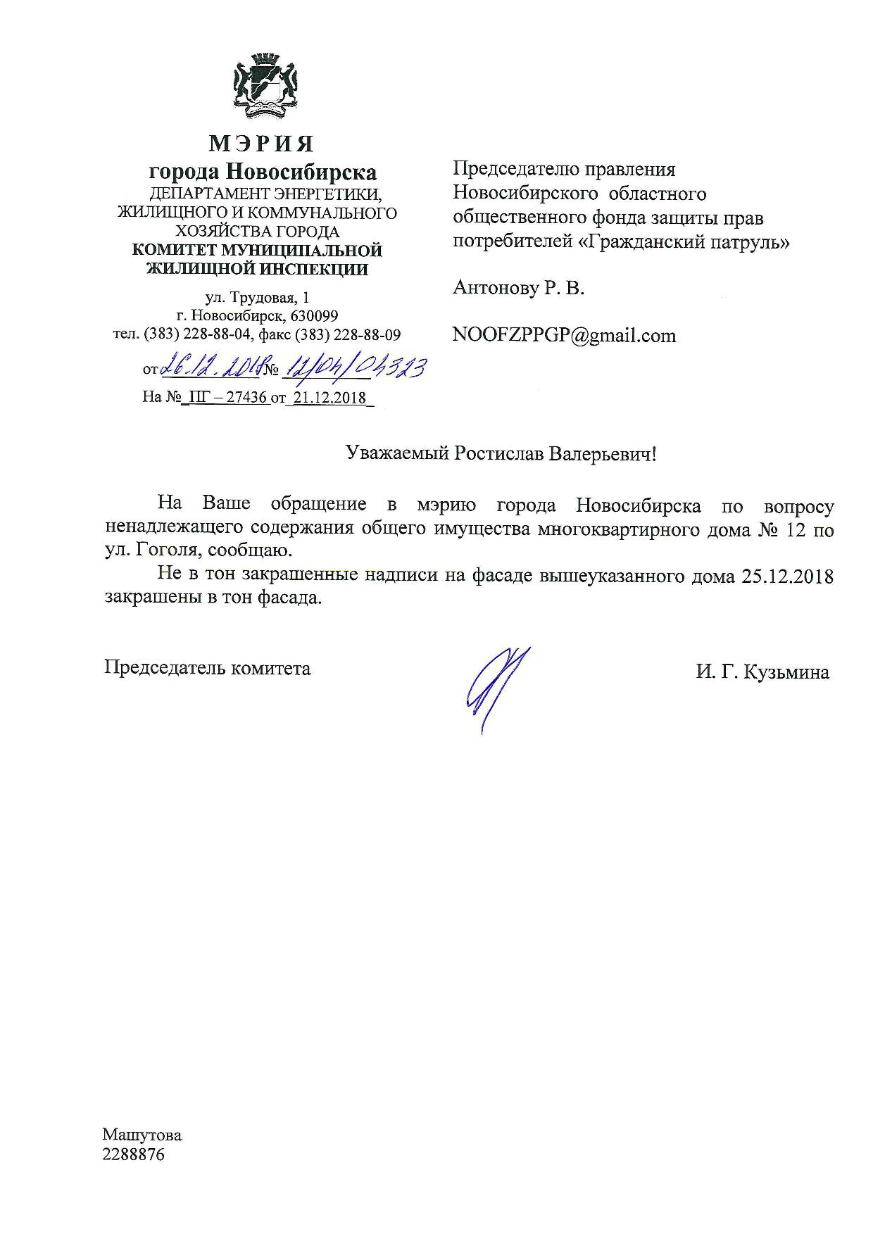 Номер жалобы:47331 Тип жалобы:Иные проблемы ЖКХ Название объекта: Регион:Новосибирская область Город:Новосибирск Адрес:Новосибирск, улица Гоголя, 12 Описание жалобы:Надписи на хозяйственном корпусе рядом с домом Статус: