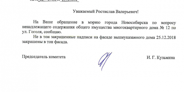 Номер жалобы:47332 Тип жалобы:Иные проблемы ЖКХ Название объекта: Регион:Новосибирская область Город:Новосибирск Адрес:Новосибирск, улица Гоголя, 12 Описание жалобы:Надписи на фасаде дома закрашены не в тон Статус: