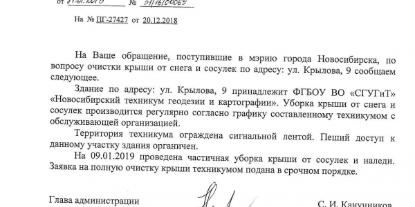 Номер жалобы:47329 Тип жалобы:Иные проблемы ЖКХ Название объекта: Регион:Новосибирская область Город:Новосибирск Адрес:улица Крылова, 5 Описание жалобы:Сосульки на крыше дома Статус: