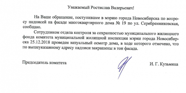 Номер жалобы:47266 Тип жалобы:Иные проблемы ЖКХ Название объекта: Регион:Новосибирская область Город:Новосибирск Адрес:Новосибирск, Красный проспект, 10 Описание жалобы:Надписи на фасаде дома Статус: