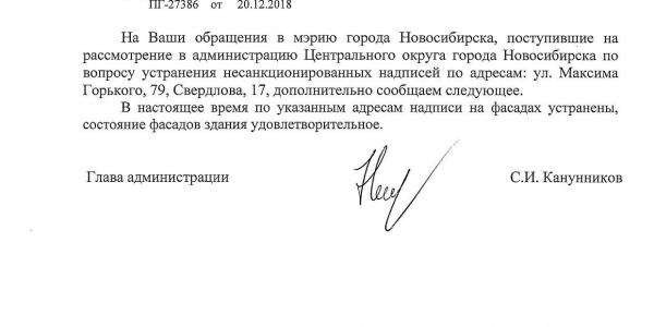 Номер жалобы:47257 Тип жалобы:Иные проблемы ЖКХ Название объекта: Регион:Новосибирская область Город:Новосибирск Адрес:улица Свердлова, 17 Описание жалобы:Надписи на фасаде дома Статус: