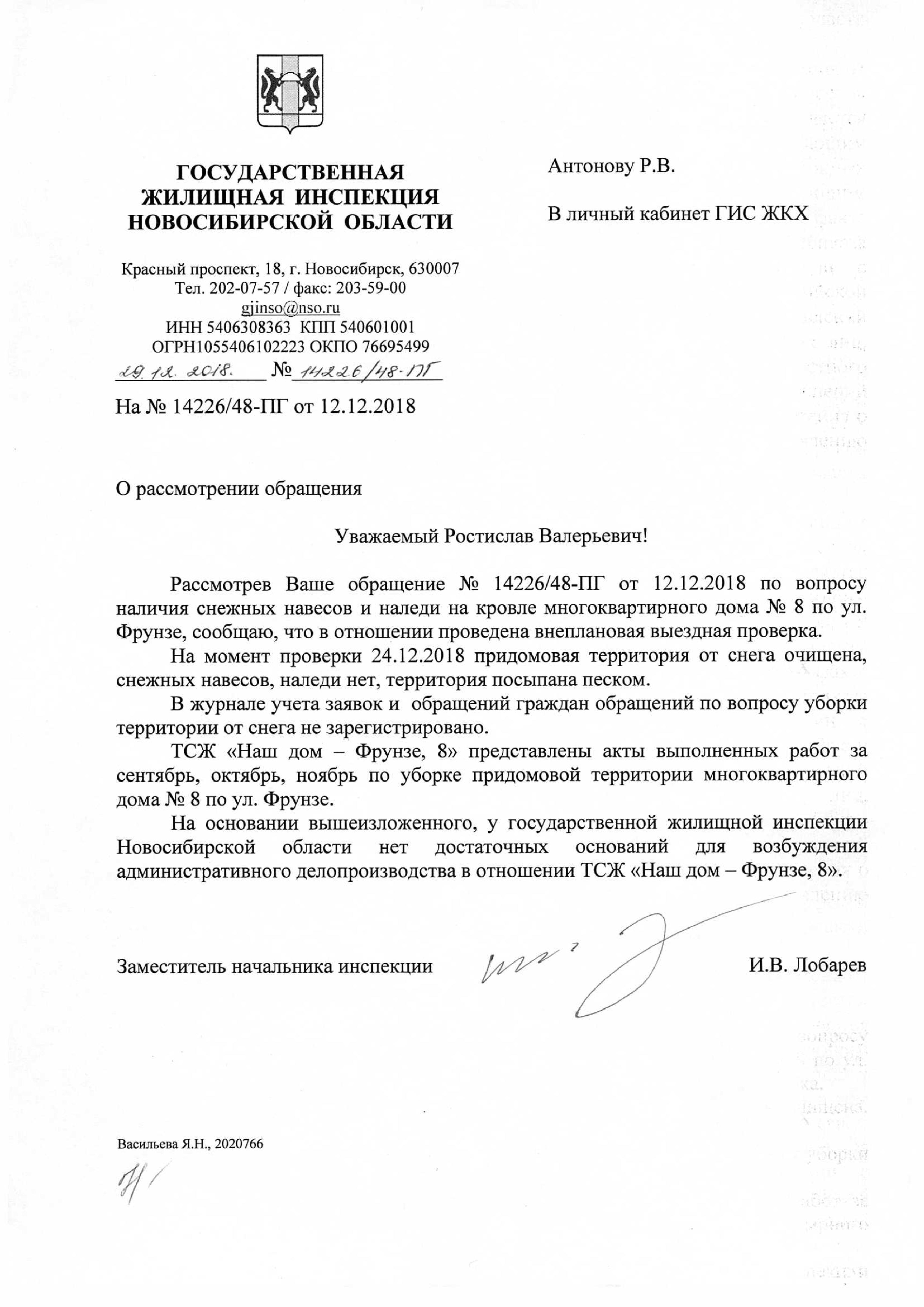 Номер жалобы:46987 Тип жалобы:Иные проблемы ЖКХ Название объекта: Регион:Новосибирская область Город:Новосибирск Адрес:Новосибирск, улица Фрунзе, 8 Описание жалобы:Снег на козырьке подъезда Статус: