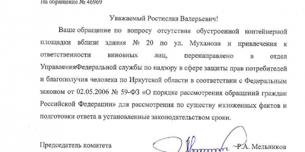 Номер жалобы:46969 Тип жалобы:Иные проблемы ЖКХ Название объекта: Регион:Иркутская область Город:Братск Адрес:улица Муханова, 20 Описание жалобы:Контейнер мусорный без ограждения и фундамента у здания роспотребнадзора Статус: