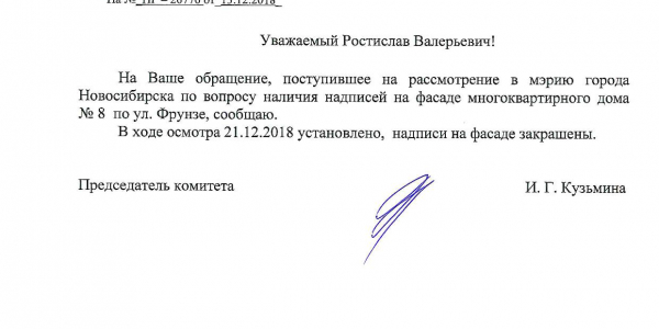Номер жалобы:46984 Тип жалобы:Иные проблемы ЖКХ Название объекта: Регион:Новосибирская область Город:Новосибирск Адрес:Новосибирск, улица Фрунзе, 8 Описание жалобы:Надписи на фасаде дома Статус: