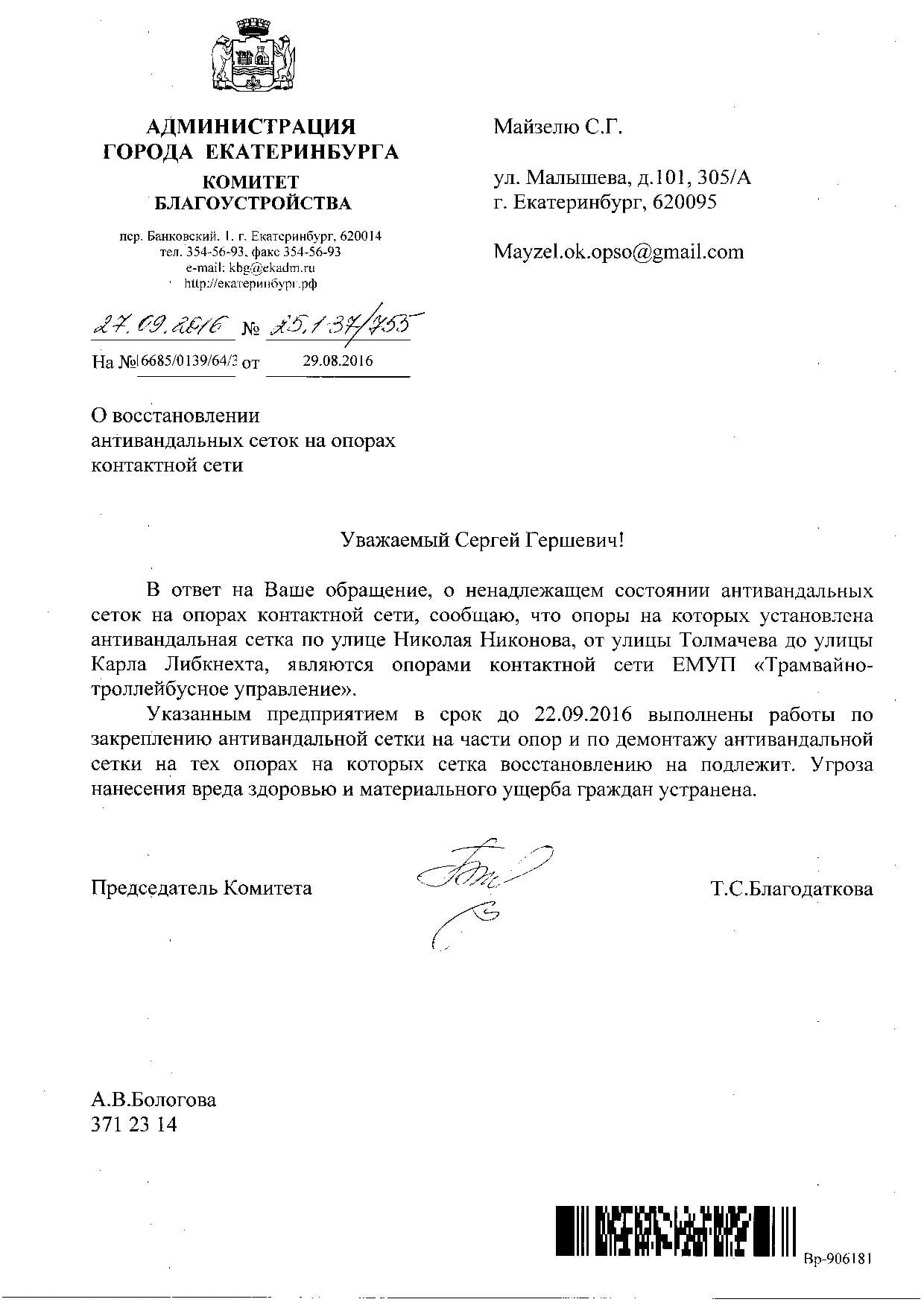 Номер жалобы:8297 Тип жалобы:Ненадлежащее содержание малых архитектурных форм Название объекта:Администрация Екатеринбурга Регион:Свердловская область Город:Екатеринбург Адрес:ул. Николая Никонова, 4 Описание жалобы:На нечётной стороне Никонова на участке от Толмачёва до Карла Либкнехта на столбах освещения ненадёжно закреплена сетка. Статус: