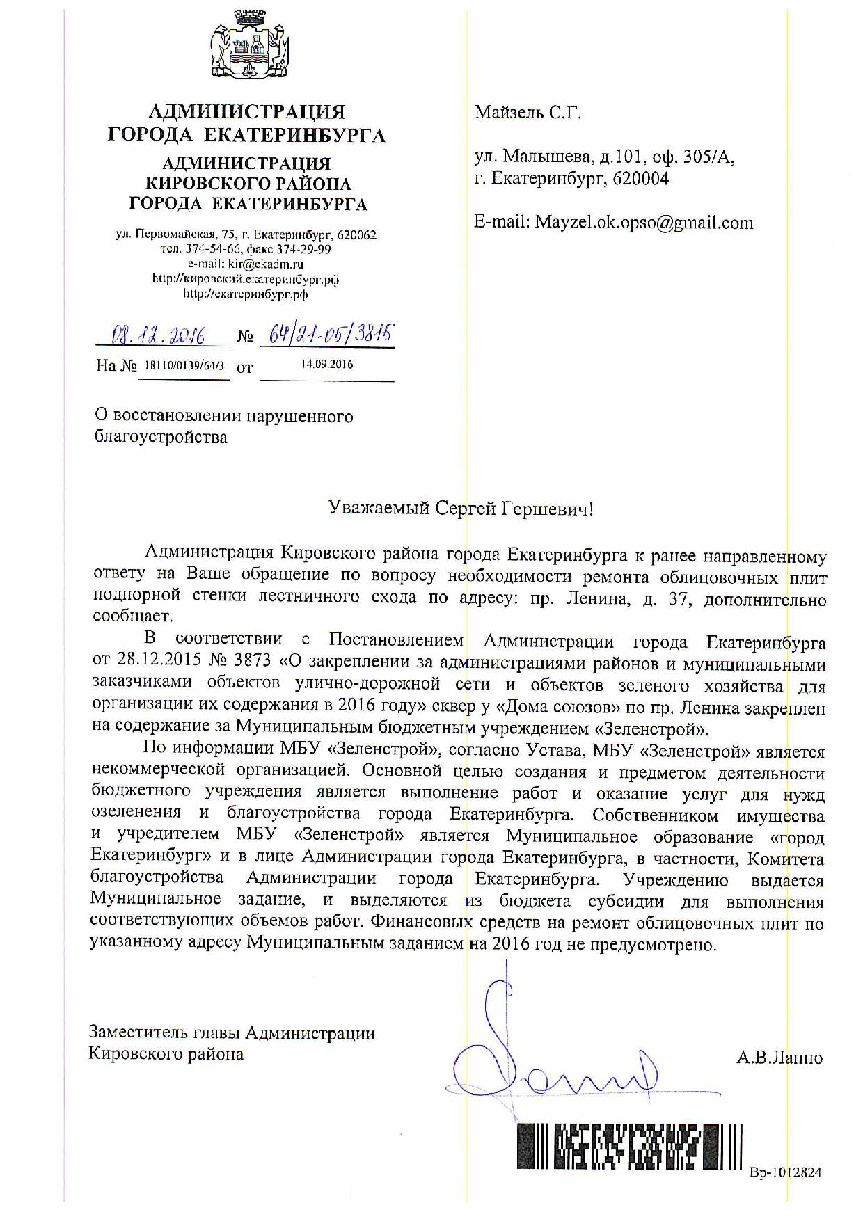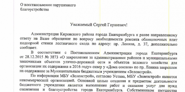 Номер жалобы:8994 Тип жалобы:Ненадлежащее содержание малых архитектурных форм Название объекта:Администрация Екатеринбурга Регион:Свердловская область Город:Екатеринбург Адрес:просп. Ленина, 37 Описание жалобы:Необходим ремонт облицовки подпорной стенки лестницы, ведущей ко входу в дом 37 по проспекту Ленина. Статус: