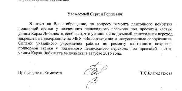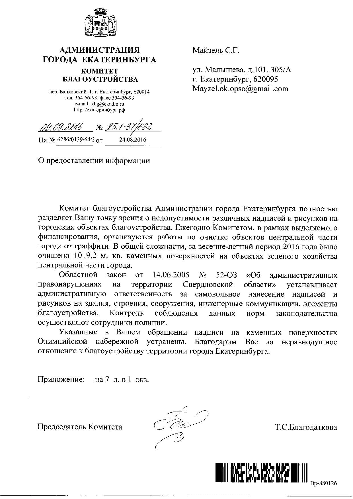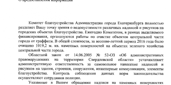 Номер жалобы:8182 Тип жалобы:Ненадлежащее содержание малых архитектурных форм Название объекта:Администрация Екатеринбурга Регион:Свердловская область Город:Екатеринбург Адрес:ул. Челюскинцев, 58 Описание жалобы:На бордюра нижней аллеи Олимпийской набережной в районе дома 58 по улице Челюскинцев нанесены надписи. Статус: