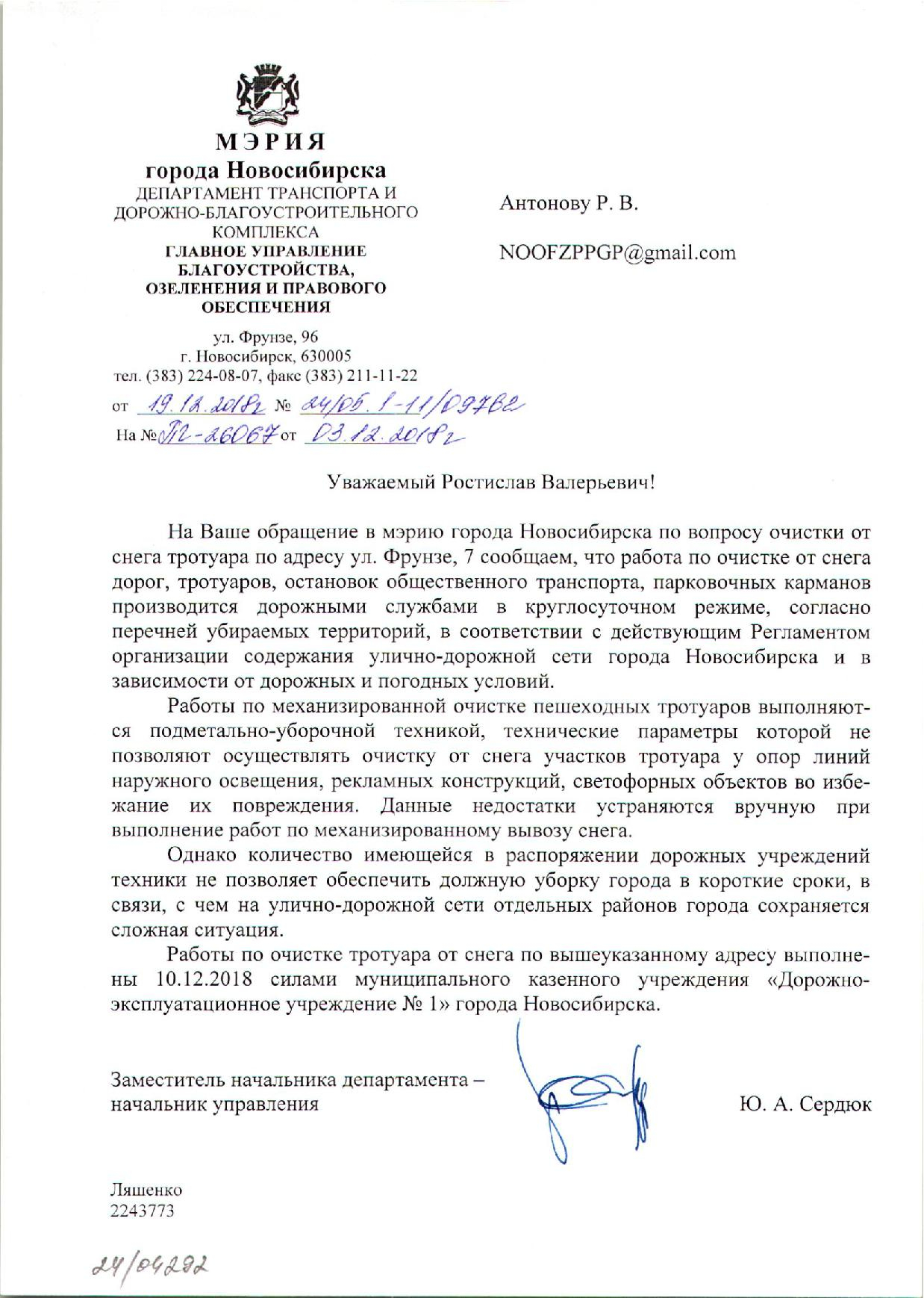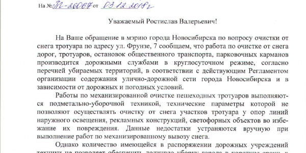 Номер жалобы:46561 Тип жалобы:Иные проблемы ЖКХ Название объекта: Регион:Новосибирская область Город:Новосибирск Адрес:Новосибирск, улица Фрунзе, 7 Описание жалобы:Нерасчищенный тротуар перед домом Статус: