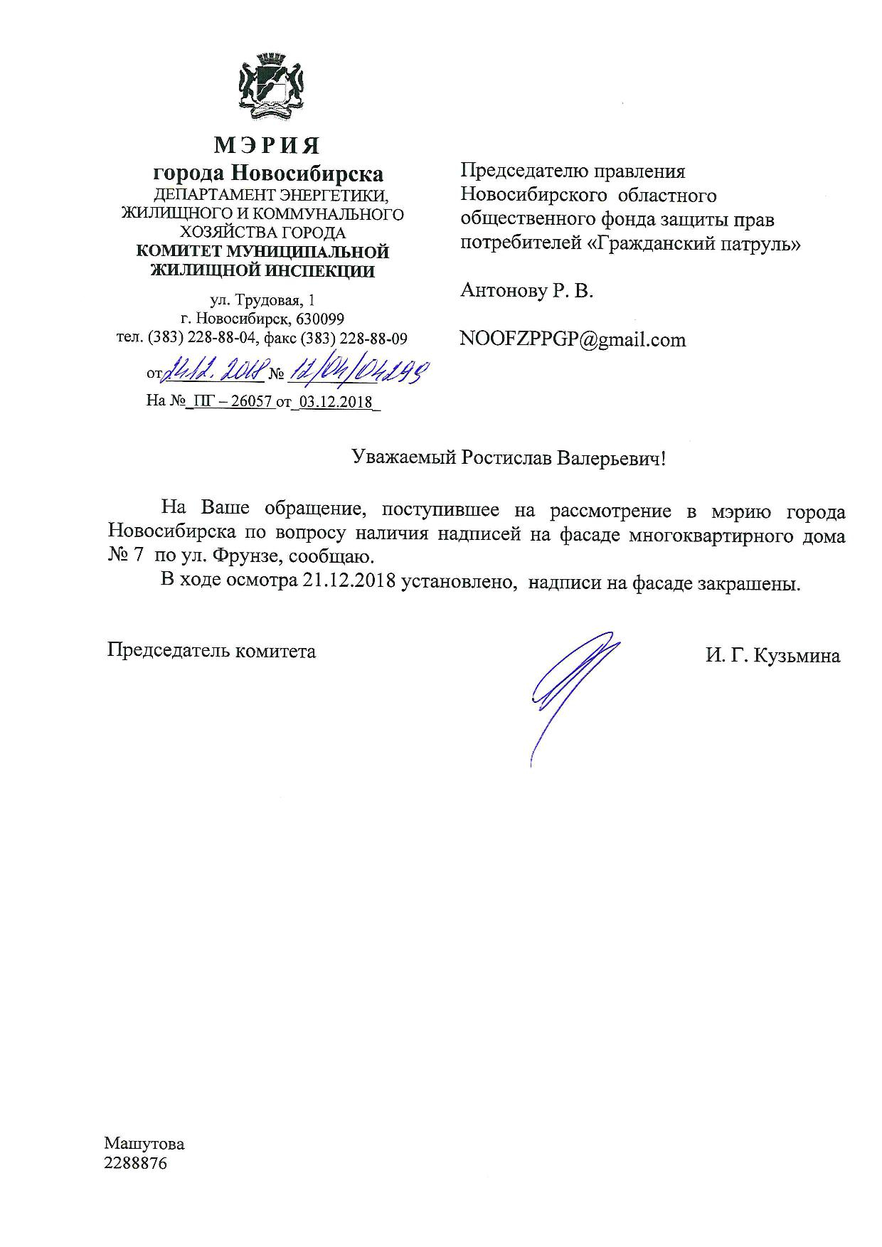 Номер жалобы:46562 Тип жалобы:Иные проблемы ЖКХ Название объекта: Регион:Новосибирская область Город:Новосибирск Адрес:Новосибирск, улица Фрунзе, 7 Описание жалобы:Надписи на фасаде дома Статус: