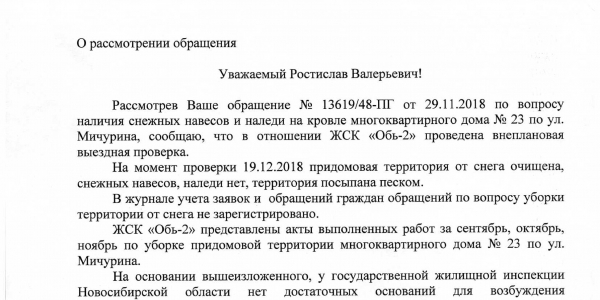 Номер жалобы:46489 Тип жалобы:Иные проблемы ЖКХ Название объекта: Регион:Новосибирская область Город:Новосибирск Адрес:Новосибирск, улица Мичурина, 5 Описание жалобы:Снег на крыше дома Статус: