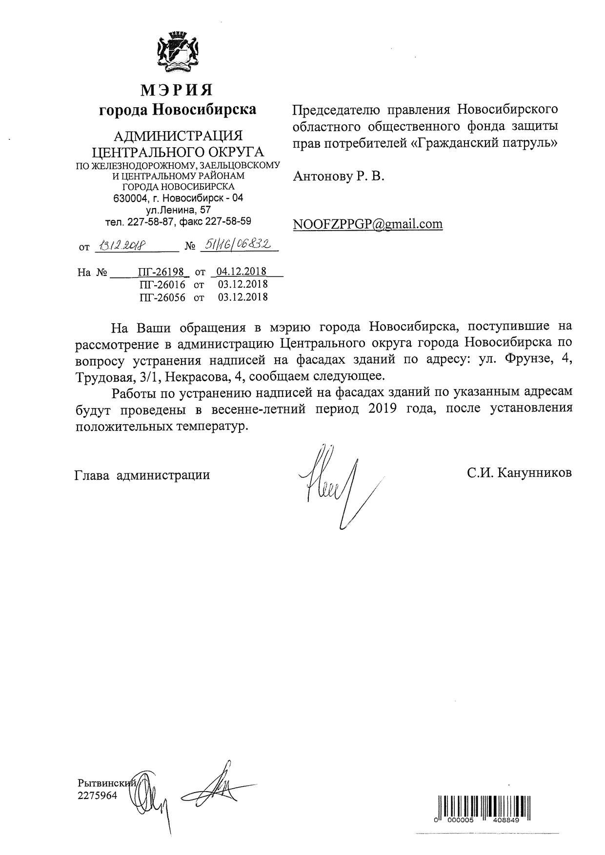 Номер жалобы:46287 Тип жалобы:Иные проблемы ЖКХ Название объекта: Регион:Новосибирская область Город:Новосибирск Адрес:Новосибирск, Советская улица, 52 Описание жалобы:Надписи на фасаде дома Статус: