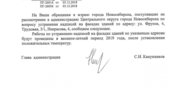 Номер жалобы:46297 Тип жалобы:Иные проблемы ЖКХ Название объекта: Регион:Новосибирская область Город:Новосибирск Адрес:улица Некрасова, 4 Описание жалобы:Надписи на фасаде дома Статус: