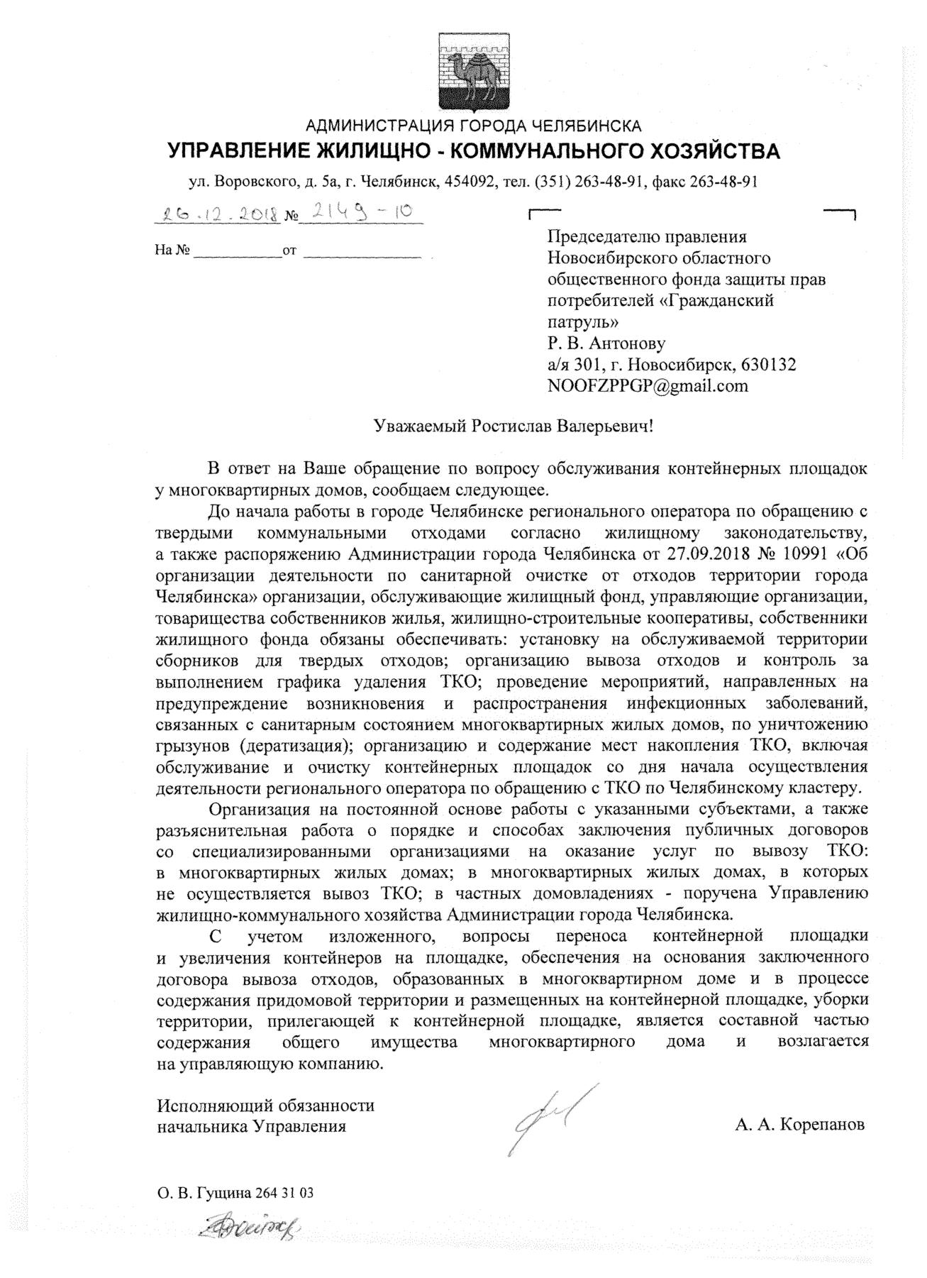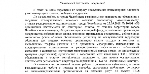 Номер жалобы:46236 Тип жалобы:Иные проблемы ЖКХ Название объекта:Мусорные контейнеры Регион:Челябинская область Город:Челябинск Адрес:ул. Стахановцев, 110 Описание жалобы:Мусорные контейнеры стоят на проезжей части междворовых проездов (рядом с домом ул. Стахановцев 110), мешая двигаться пешеходам и автомобилям, необходимо реконструировать контейнерную площадку для возможности установки туда новых пластиковых контейнеров Статус: