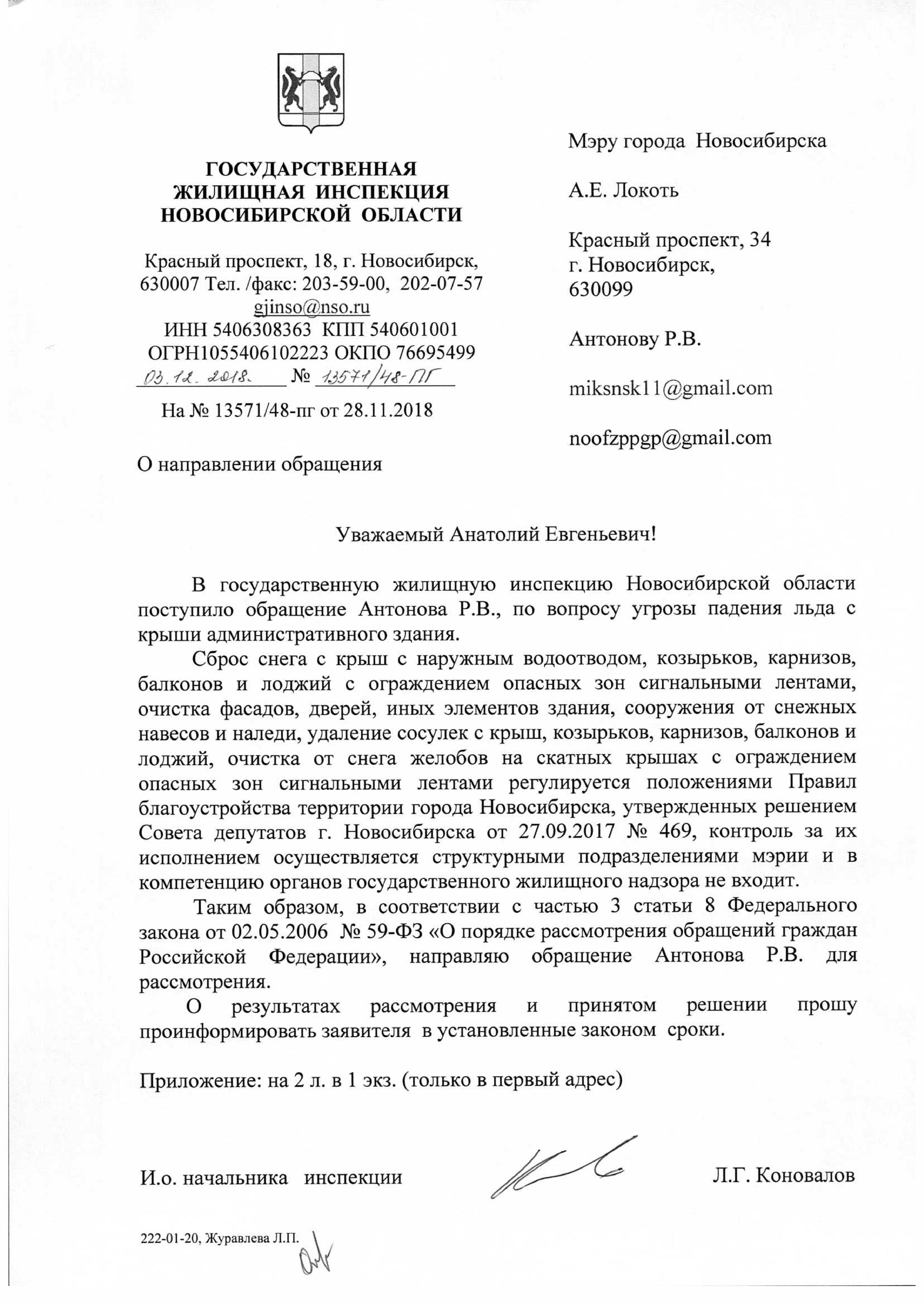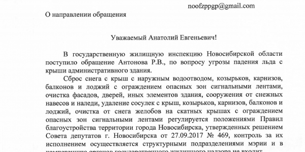 Номер жалобы:46228 Тип жалобы:Иные проблемы ЖКХ Название объекта: Регион:Новосибирская область Город:Новосибирск Адрес:Новосибирск, Красный проспект, 72 Описание жалобы:Сосульки на крыше дома Статус: