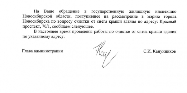 Номер жалобы:46211 Тип жалобы:Иные проблемы ЖКХ Название объекта: Регион:Новосибирская область Город:Новосибирск Адрес:Красный проспект, 70/1 Описание жалобы:Снег на крыше дома Статус: