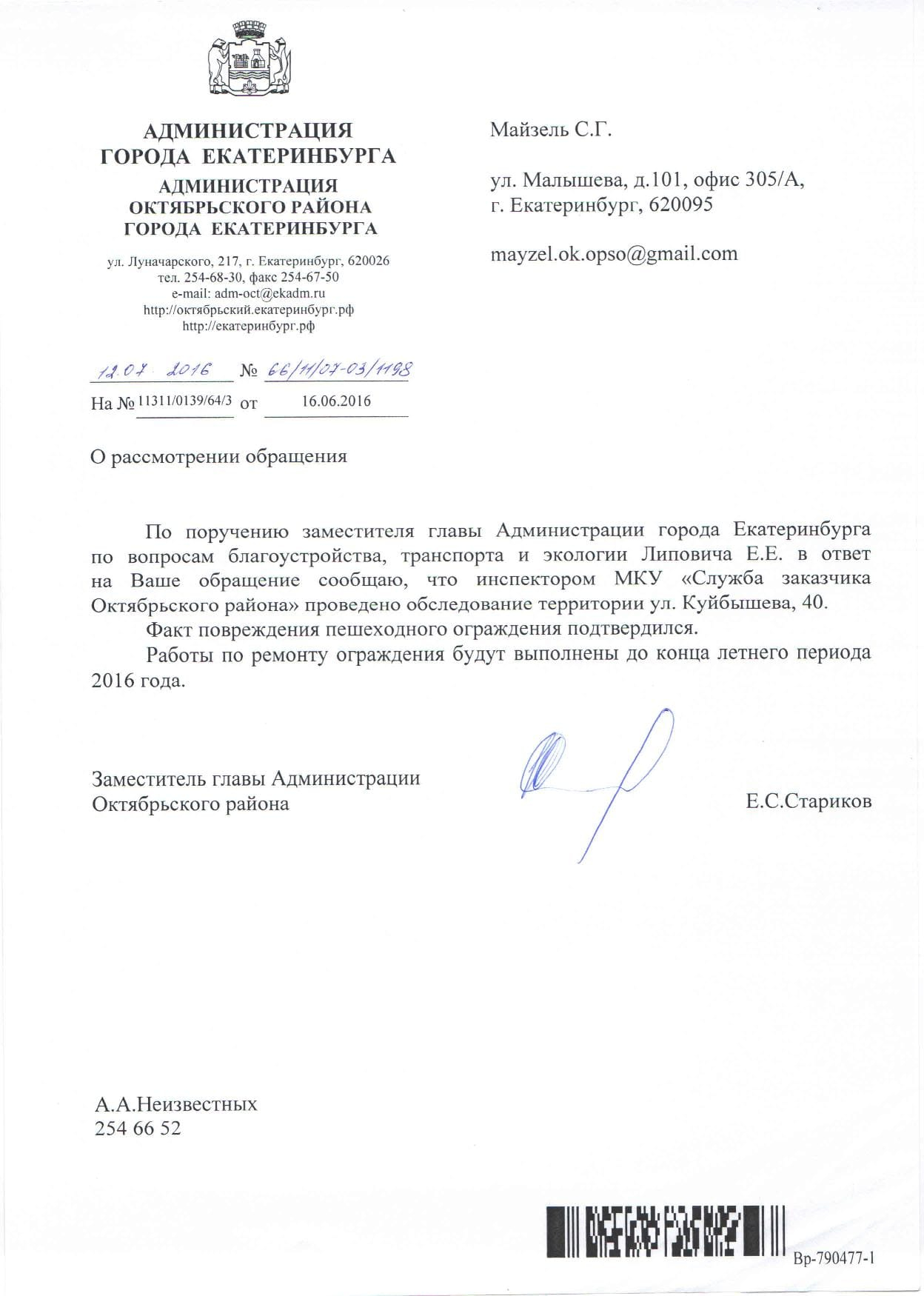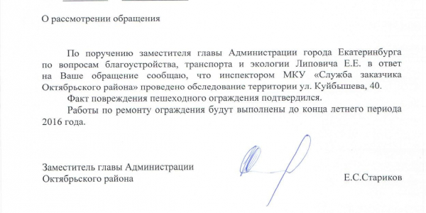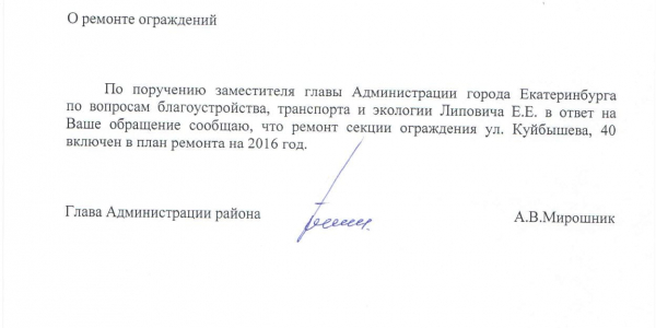 Номер жалобы:5706 Тип жалобы:Ненадлежащее содержание малых архитектурных форм Название объекта: Регион:Свердловская область Город:Екатеринбург Адрес:Куйбышева, 40 Описание жалобы:Необходимо починить ограду Статус: