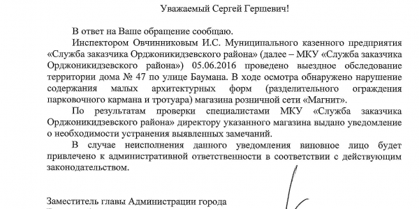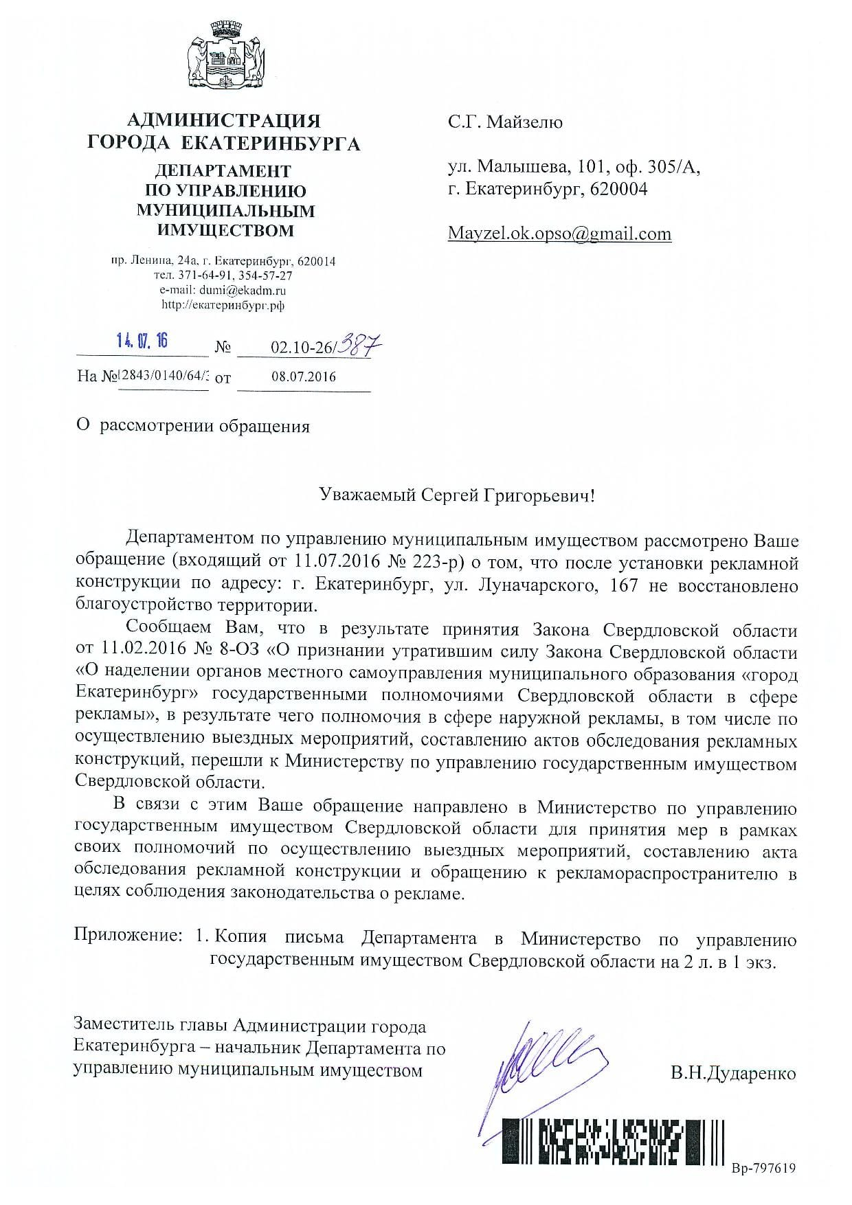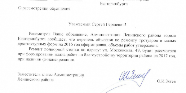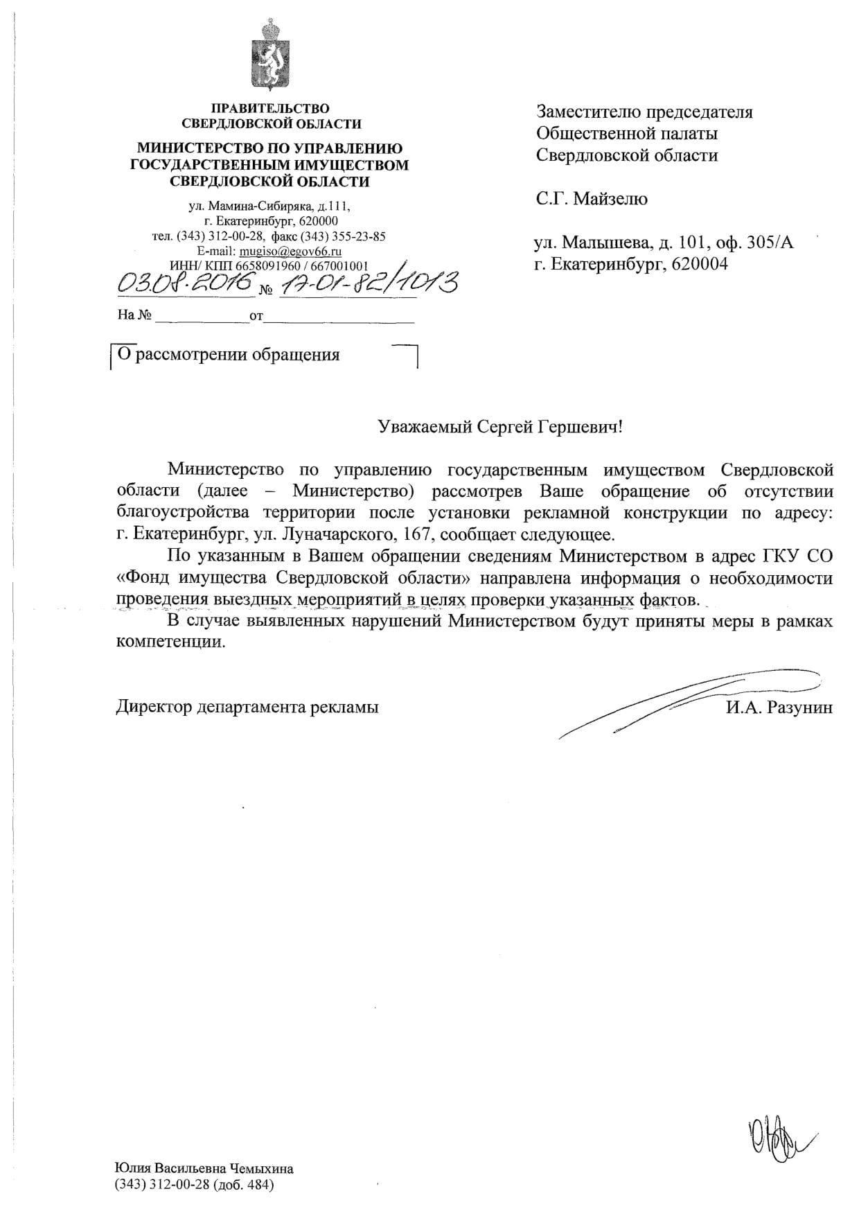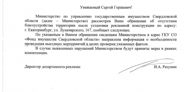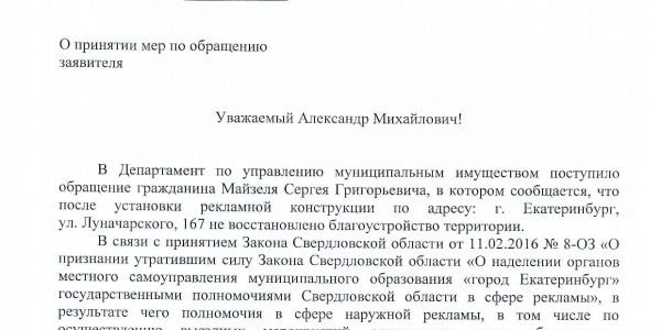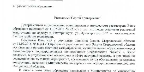 Номер жалобы:6657 Тип жалобы:Ненадлежащее содержание малых архитектурных форм Название объекта: Регион:Свердловская область Город:Екатеринбург Адрес:Луначарского, 167 Описание жалобы:Не восстановлено благоустройство после установки рекламной конструкции Статус:
