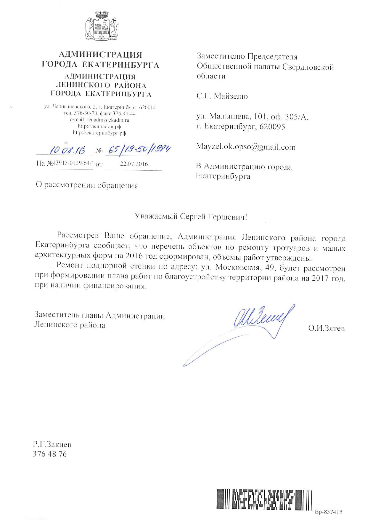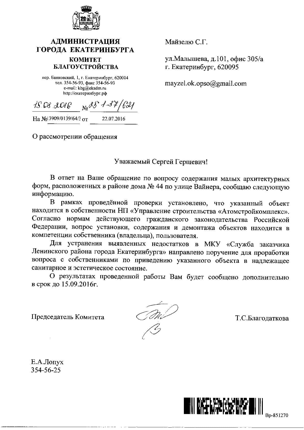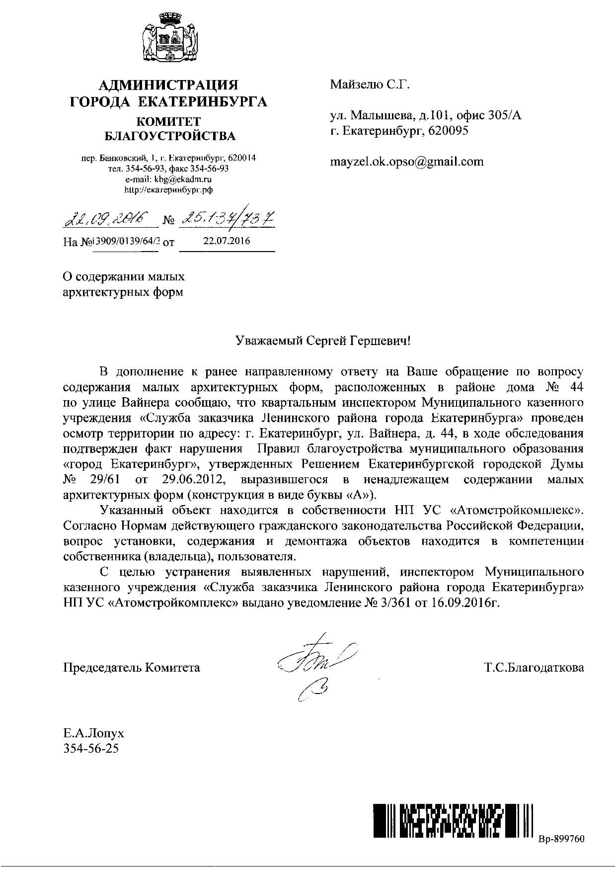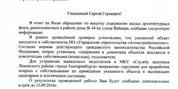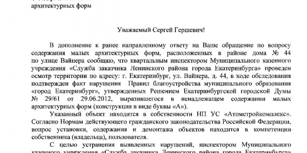 Номер жалобы:7303 Тип жалобы:Ненадлежащее содержание малых архитектурных форм Название объекта: Регион:Свердловская область Город:Екатеринбург Адрес:Вайнера, 44 Описание жалобы:Необходимо очистить от объявлений малые архитектурные формы Статус:
