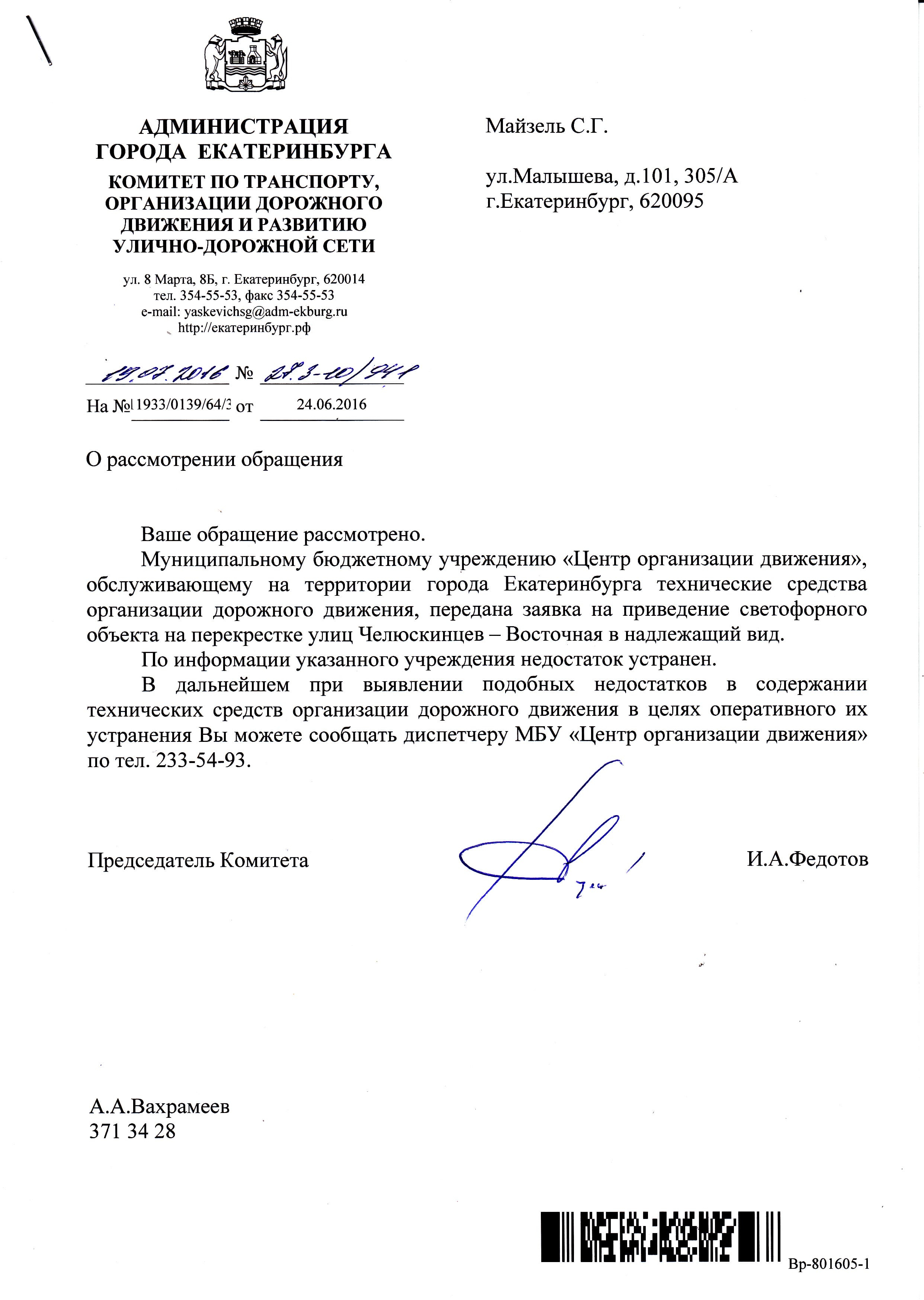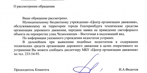 Номер жалобы:6153 Тип жалобы:Ненадлежащее содержание малых архитектурных форм Название объекта:Администрация Екатеринбурга Регион:Свердловская область Город:Екатеринбург Адрес:Восточная ул., Описание жалобы:На перекрёстке Восточной и Челюскинцев со стороны Восточной, 1 из опоры светофора, на которой установлены пешеходная секция для перехода через Челюскинцев и трамвайная секция, торчат обрезки проводов. Статус: