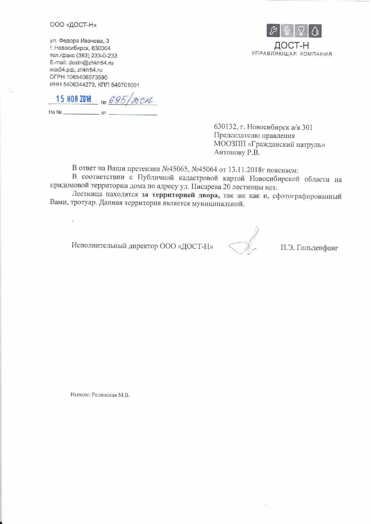 Номер жалобы:45059 Тип жалобы:Иные проблемы ЖКХ Название объекта:Управляющая Компания Регион:Новосибирская область Город:Новосибирск Адрес:пер 2-й Краснодонский, 4 Описание жалобы:Не расчищена лестница Статус: