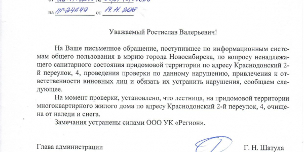 Номер жалобы:45054 Тип жалобы:Иные проблемы ЖКХ Название объекта:Управляющая Компания Адрес:(55.047562215222065, 82.91846327483654) Описание жалобы:Краснодарский 2 переулок 4, не расчищена лестница Статус:
