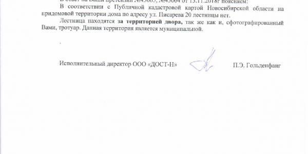 Номер жалобы:45065 Тип жалобы:Иные проблемы ЖКХ Название объекта:Управляющая Компания Регион:Новосибирская область Город:Новосибирск Адрес:ул. Писарева, 20 Описание жалобы:Не расчищена лестница Статус: