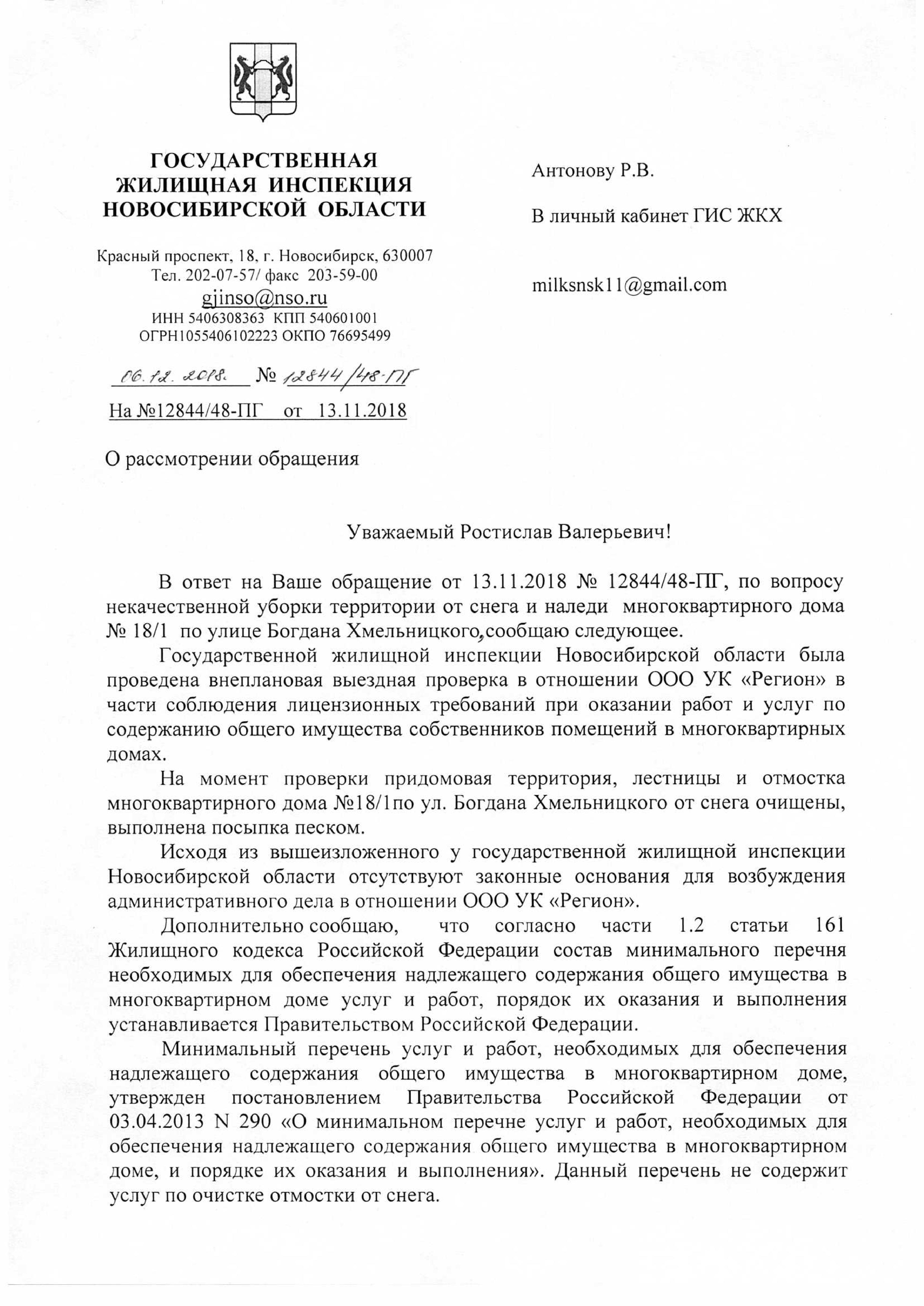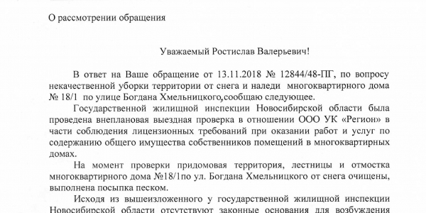 Номер жалобы:45021 Тип жалобы:Иные проблемы ЖКХ Название объекта:Управляющая Компания Регион:Новосибирская область Город:Новосибирск Адрес:ул Богдана Хмельницкого, 18/1 Описание жалобы:не расчищенная лестница Статус: