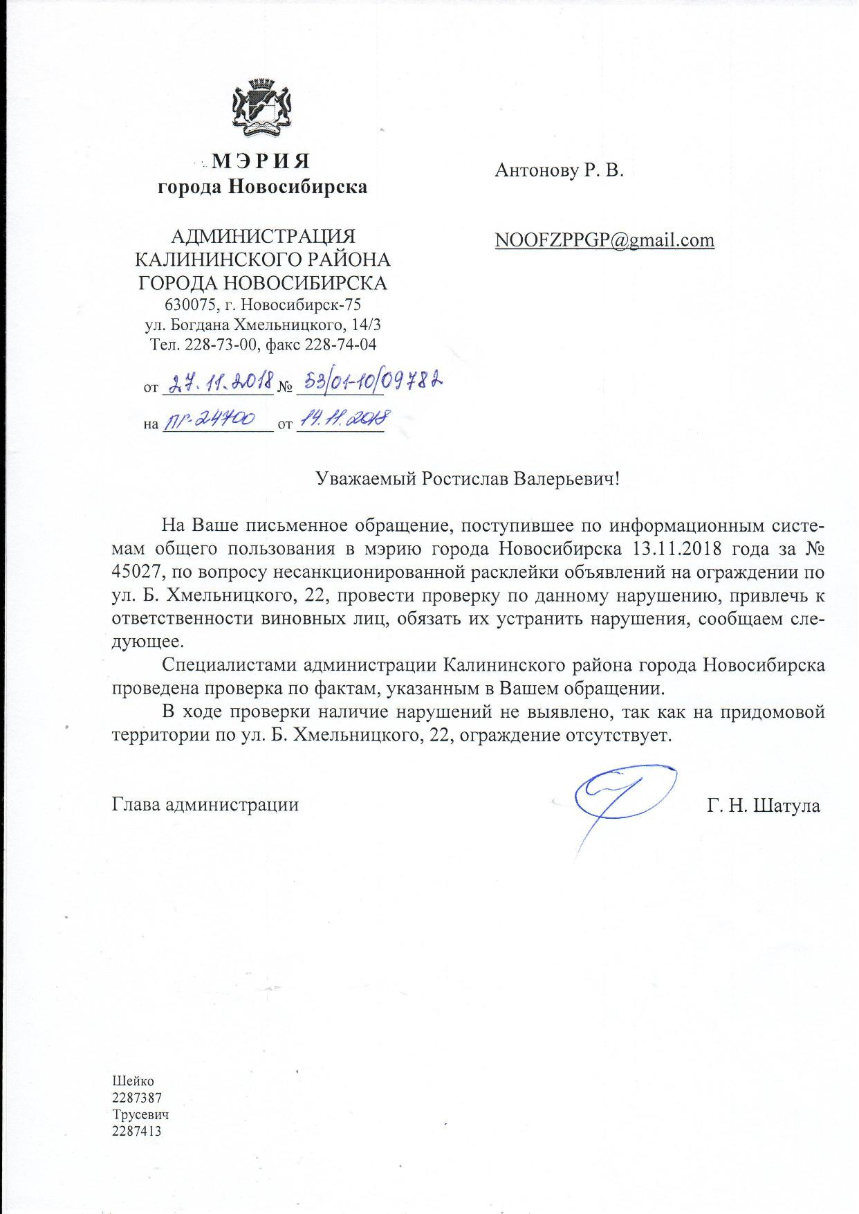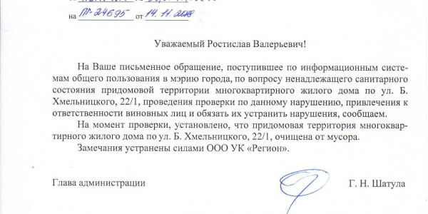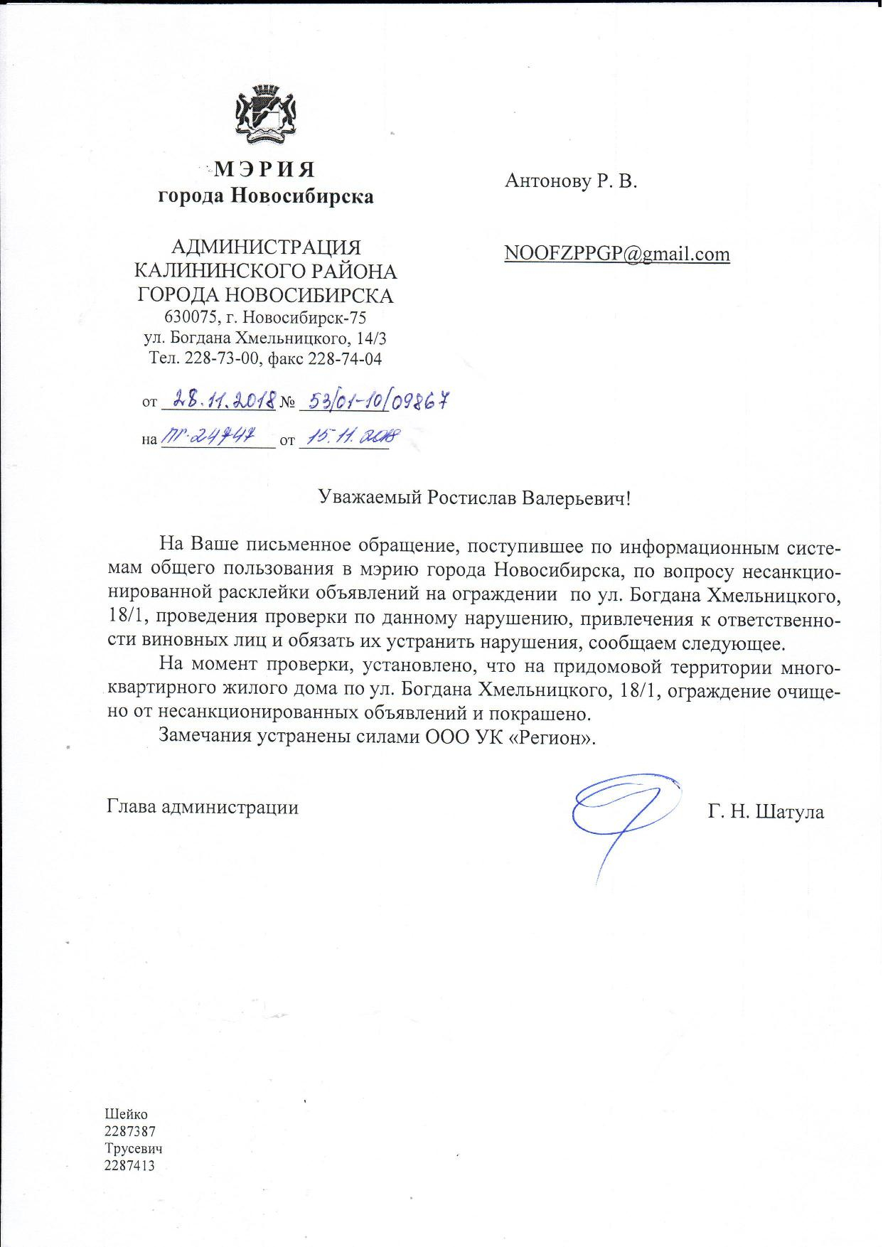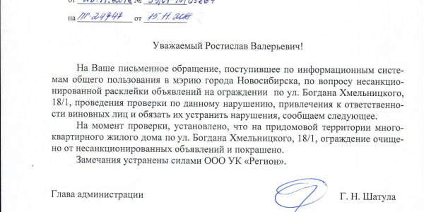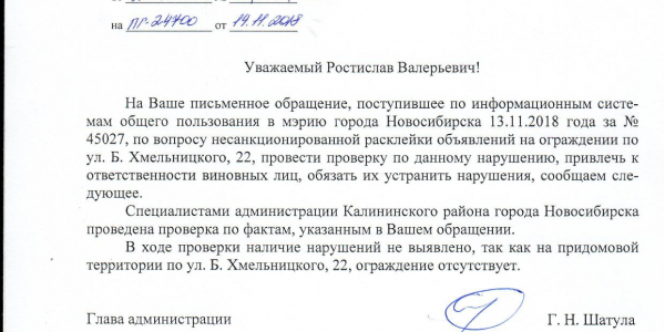 Номер жалобы:45027 Тип жалобы:Иные проблемы ЖКХ Название объекта:Управляющая Компания Регион:Новосибирская область Город:Новосибирск Адрес:ул Богдана Хмельницкого, 22 Описание жалобы:объявления в неположенном месте Статус: