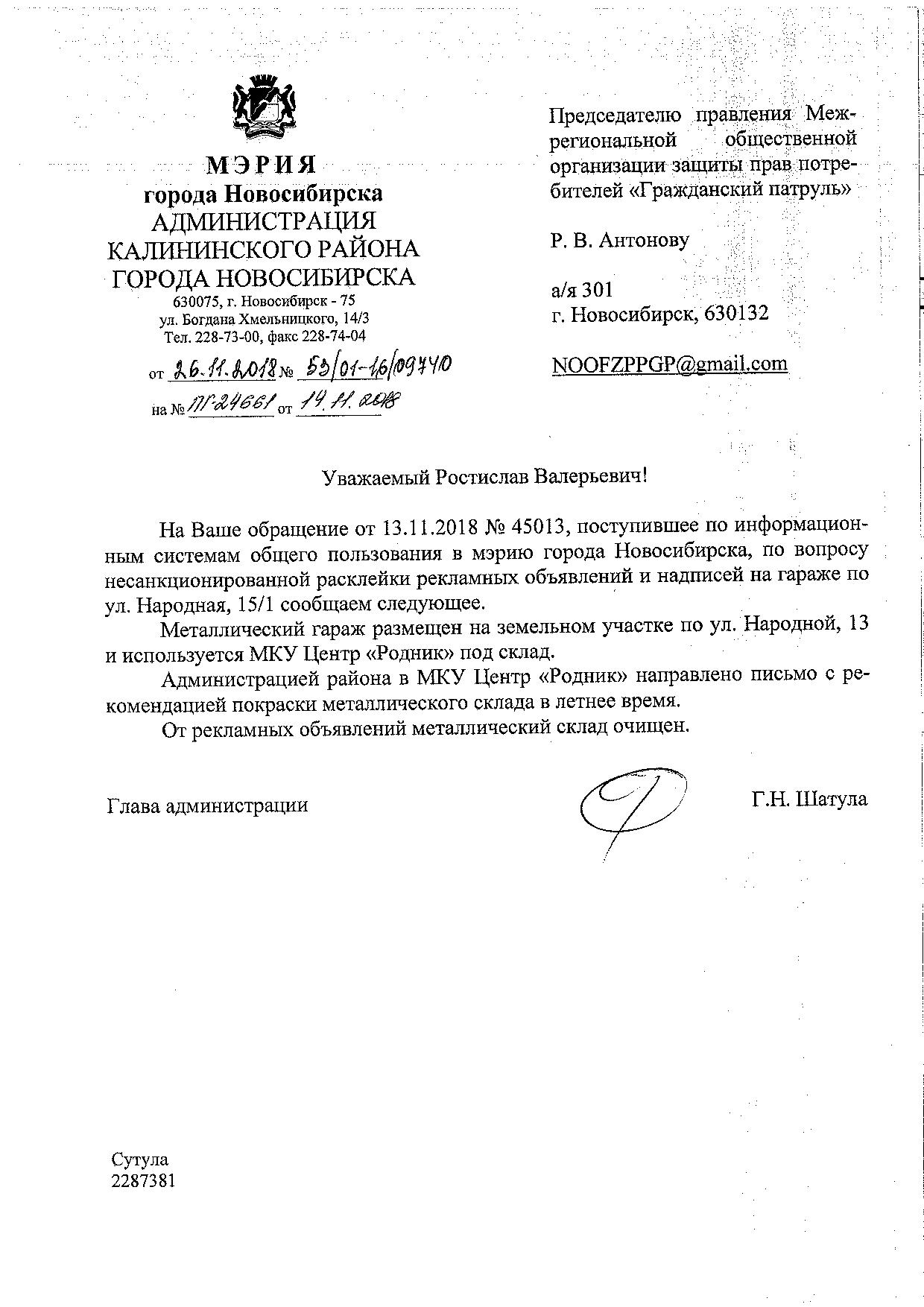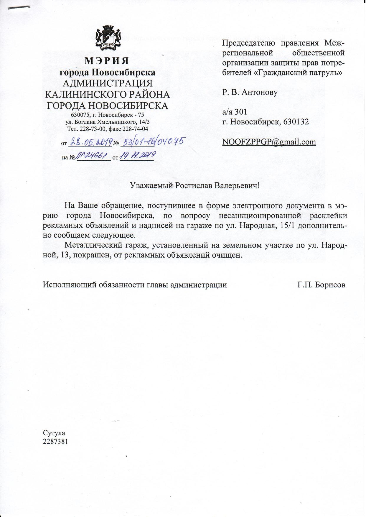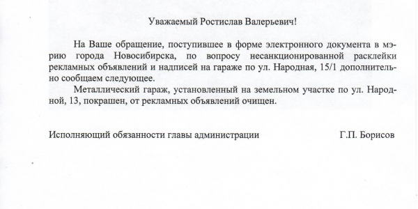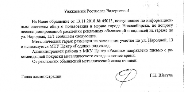Номер жалобы:45013 Тип жалобы:Иные проблемы ЖКХ Название объекта:Управляющая Компания Регион:Новосибирская область Город:Новосибирск Адрес:ул Народная, 15/1 Описание жалобы:Надписи и объявления на гараже Статус:
