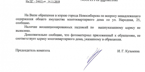 Номер жалобы:45018 Тип жалобы:Иные проблемы ЖКХ Название объекта:Управляющая Компания Адрес:(55.04748211843473, 82.91846092790364) Описание жалобы:45002 Народная 21/1, надписи на фасаде дома закрашены не в тон Статус: