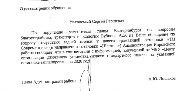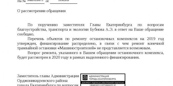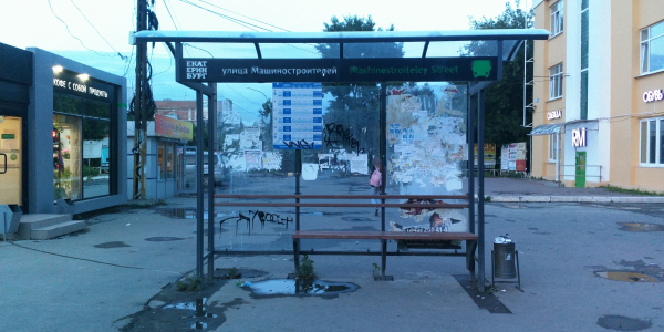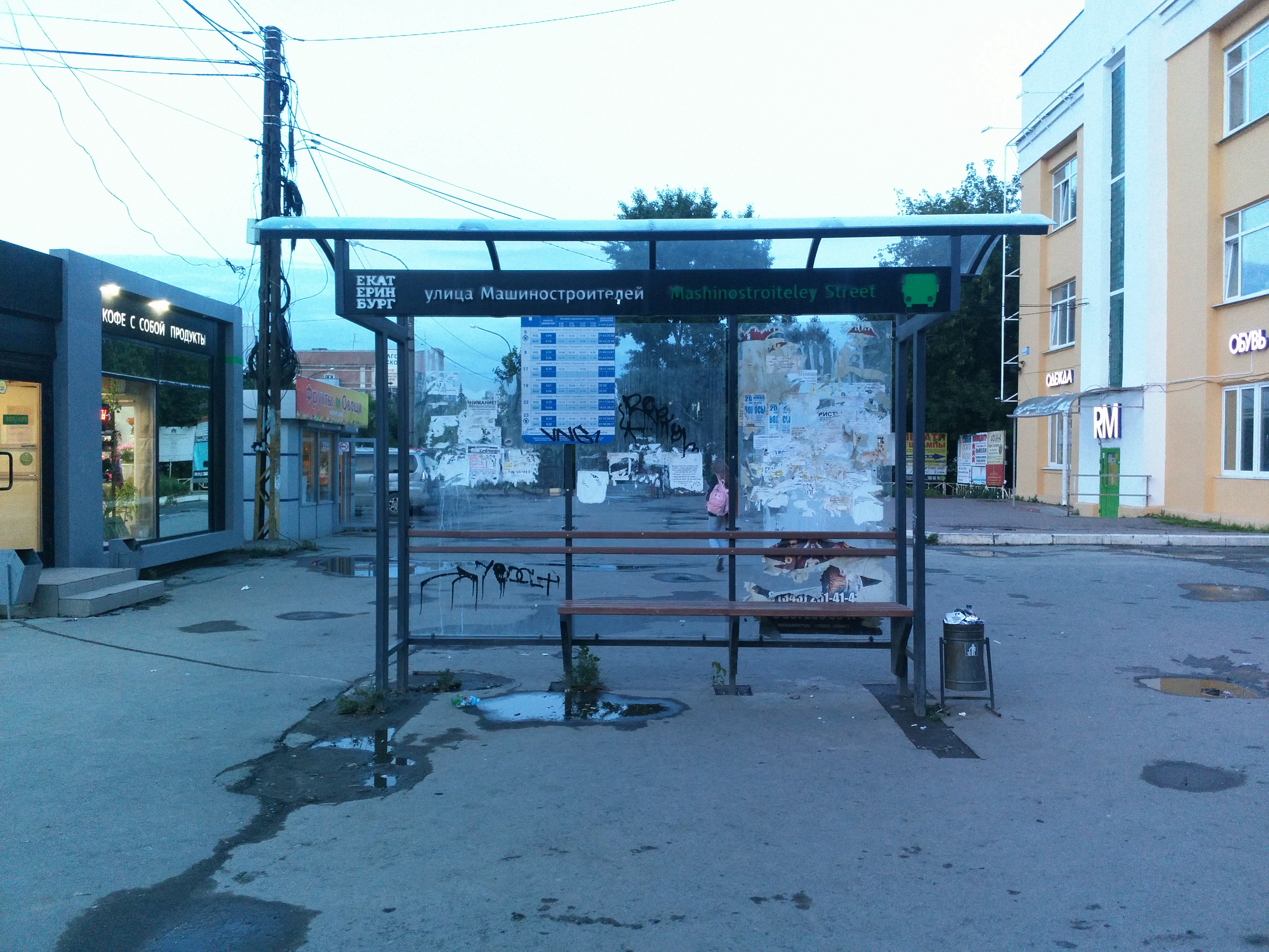 Номер жалобы:58651 Тип жалобы:Ненадлежащее содержание малых архитектурных форм Название объекта:мэрия Регион:Свердловская область Город:Екатеринбург Адрес:улица Машиностроителей, 29А Описание жалобы:Треснуло стекло на навесе на конечной трамвайной остановке «Машиностроителей». Статус: