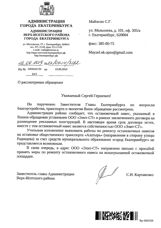 Номер жалобы:58656 Тип жалобы:Ненадлежащее содержание малых архитектурных форм Название объекта:мэрия Регион:Свердловская область Город:Екатеринбург Адрес:улица Малышева, 5 Описание жалобы:У навеса на трамвайной остановке «ТЦ Алатырь» в направлении улицы Радищева отсутствует задняя стенка. Вместо неё натянуты рекламные плакаты. Статус: