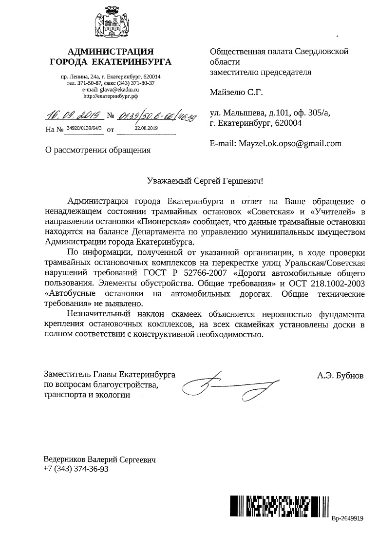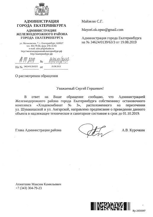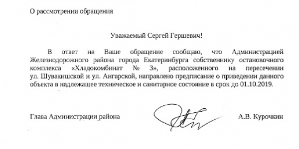 Номер жалобы:58657 Тип жалобы:Ненадлежащее содержание малых архитектурных форм Название объекта:мэрия Регион:Свердловская область Город:Екатеринбург Адрес:Ангарская улица, 36к1 Описание жалобы:Необходим ремонт потолка навеса на конечной автобусной остановке «Хладокомбинат № 3». Статус: