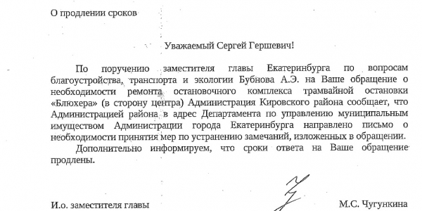 Номер жалобы:58717 Тип жалобы:Ненадлежащее содержание малых архитектурных форм Название объекта:мэрия Регион:Свердловская область Город:Екатеринбург Адрес:улица Блюхера, 10 Описание жалобы:На навесе на трамвайной остановке «Блюхера» в направлении остановки «Шарташ» листы поликарбоната оторваны от креплений. Статус: