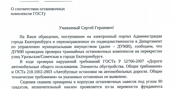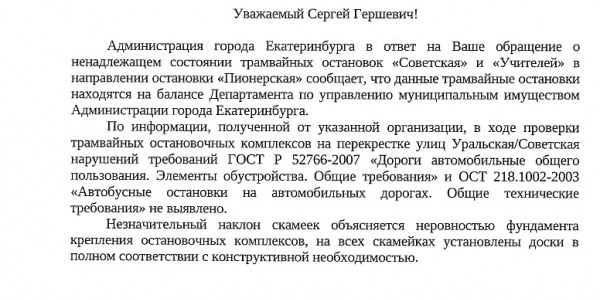 Номер жалобы:58759 Тип жалобы:Ненадлежащее содержание малых архитектурных форм Название объекта:мэрия Регион:Свердловская область Город:Екатеринбург Адрес:Уральская улица Описание жалобы:На трамвайных остановках «Советская» в направлении остановки «Пионерская» и «Учителей» в направлении остановки «Пионерская» сидения скамеек имеют наклон, а также на них отсутствует по одной доске. Статус: